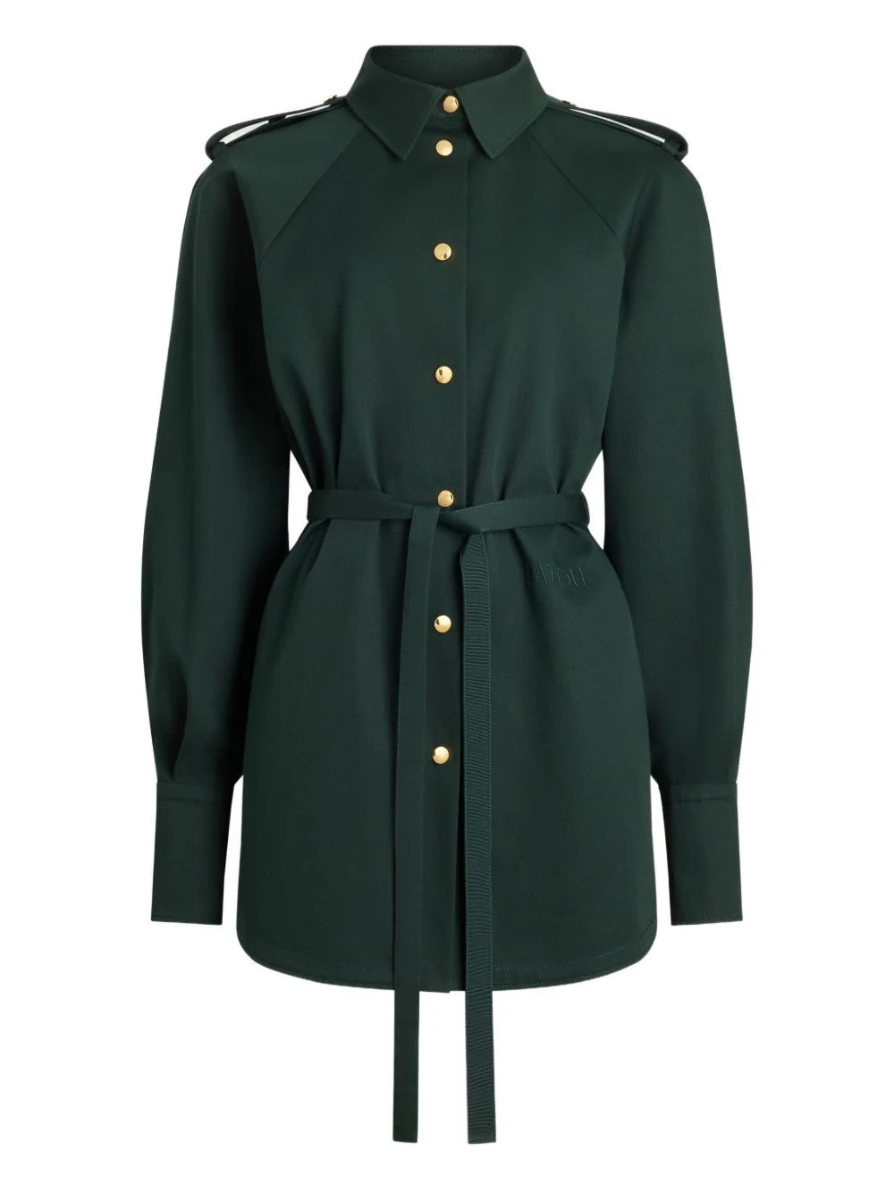 gabardine belted shirt Highlights - Dark green - Organic cotton - Gabardine - Collared neckline - Press-stud fastening - Self-tie belt - Shoulder epaulettes Imported Composition Outer: Organic Cotton 100% Lining: Viscose 100% Washing instructions Read Manufacturer Guidelines