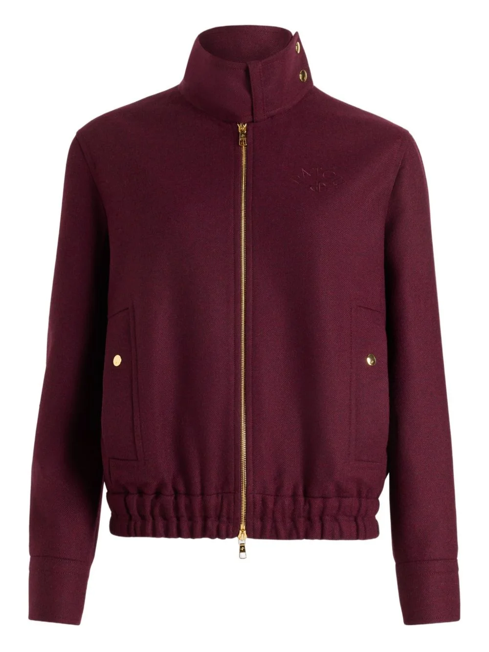 high-neck elasticated-cuffs bomber jacket Highlights - Burgundy - High neck - Zip fastening - Elasticated cuffs - Welt pockets Imported Composition Outer: Recycled Wool 70%, Polyamide 25%, Other fibres 5% Lining: Viscose 100% Washing instructions Dry Clean Only