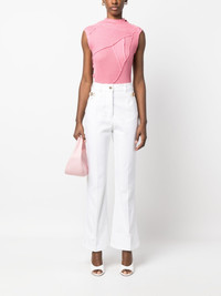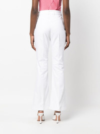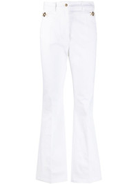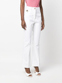 logo-embroidered flared jeans Patou's jeans honour flared styles that were characteristic of the 70s. This high-rise pair is decorated with a logo plaque and gleaming gold-tone hardware at the side slip pocket - they pop against the white background. Highlights - White - Cotton - Denim - Logo plaque - Gold-tone hardware - Pressed crease - Belt loops - Front button and zip fastening - Embroidered logo - Slip pockets to the sides - Flared cuffs Imported Composition Cotton 100% SIZE & FIT Model measurements Height 5 ft 10 in(1.77 m) Bust/Chest 29.92 in(76 cm) Hips 34.25 in(87 cm) Waist 23.62 in(60 cm) Measurement FRONT RISE 11.81 in(30 cm) INSIDE LEG 29.52 in(75 cm) HIPS 36.81 in(93.5 cm) FittingInformation Designed with a flared hem, these jeans allow for a close fit at the waist with a slim fit over the leg and widening towards the hem Sturdy and hard-wearing, this denim piece offers no stretch This piece fits true to size – take your usual size Washing instructions Machine Wash