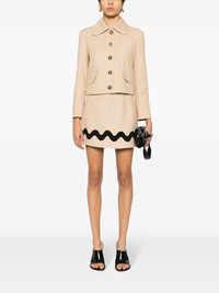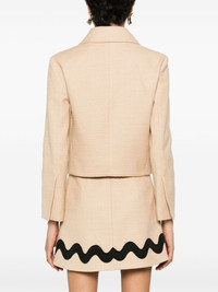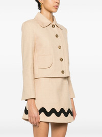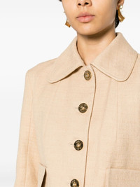 cropped tweed jacket Patou's Iconic tweed jacket features structured shoulders and is complete with logo-engraved buttons. Highlights - Sand beige - Stretch-cotton - Tweed - Rounded collar - Structured shoulders - Long sleeves with concealed buttoned cuffs - Dart detailing - Two front patch pockets with decorative flap - Satin lining - Straight hem - Logo-engraved gold-tone hardware - Front button fastening Imported Composition Cotton 97%, Polyamide 2%, Spandex/Elastane 1% SIZE & FIT Model measurements Height 5 ft 9 in(1.76 m) Bust/Chest 31.88 in(81 cm) Hips 35.43 in(90 cm) Waist 24.8 in(63 cm) FittingInformation Designed for a slim fit that sits just away from the body offering a close yet comfortable fit Made from a midweight fabric This piece fits true to size – take your usual size Washing instructions Dry Clean Only