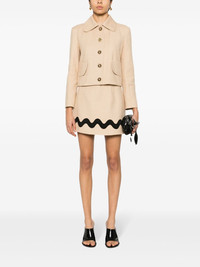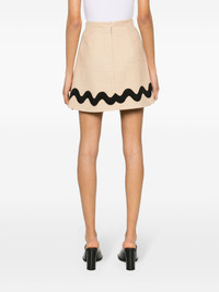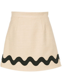 Wave tweed mini skirt Patou's Iconic beige tweed miniskirt is decorated with an embroidered wave design. Highlights - Sand beige - Stretch-cotton - Tweed - Dart detailing - Contrasting embroidered wavy stripe - Satin lining - Straight hem - Thigh-length - Concealed rear zip fastening Imported Composition Polyester 100%, Cotton 97%, Polyamide 2%, Spandex/Elastane 1% SIZE & FIT Model measurements Height 5 ft 9 in(1.76 m) Bust/Chest 31.88 in(81 cm) Hips 35.43 in(90 cm) Waist 24.8 in(63 cm) FittingInformation This mini-length skirt is intended to be worn high on the waist Made from a midweight fabric This piece fits true to size – take your usual size Washing instructions Dry Clean Only