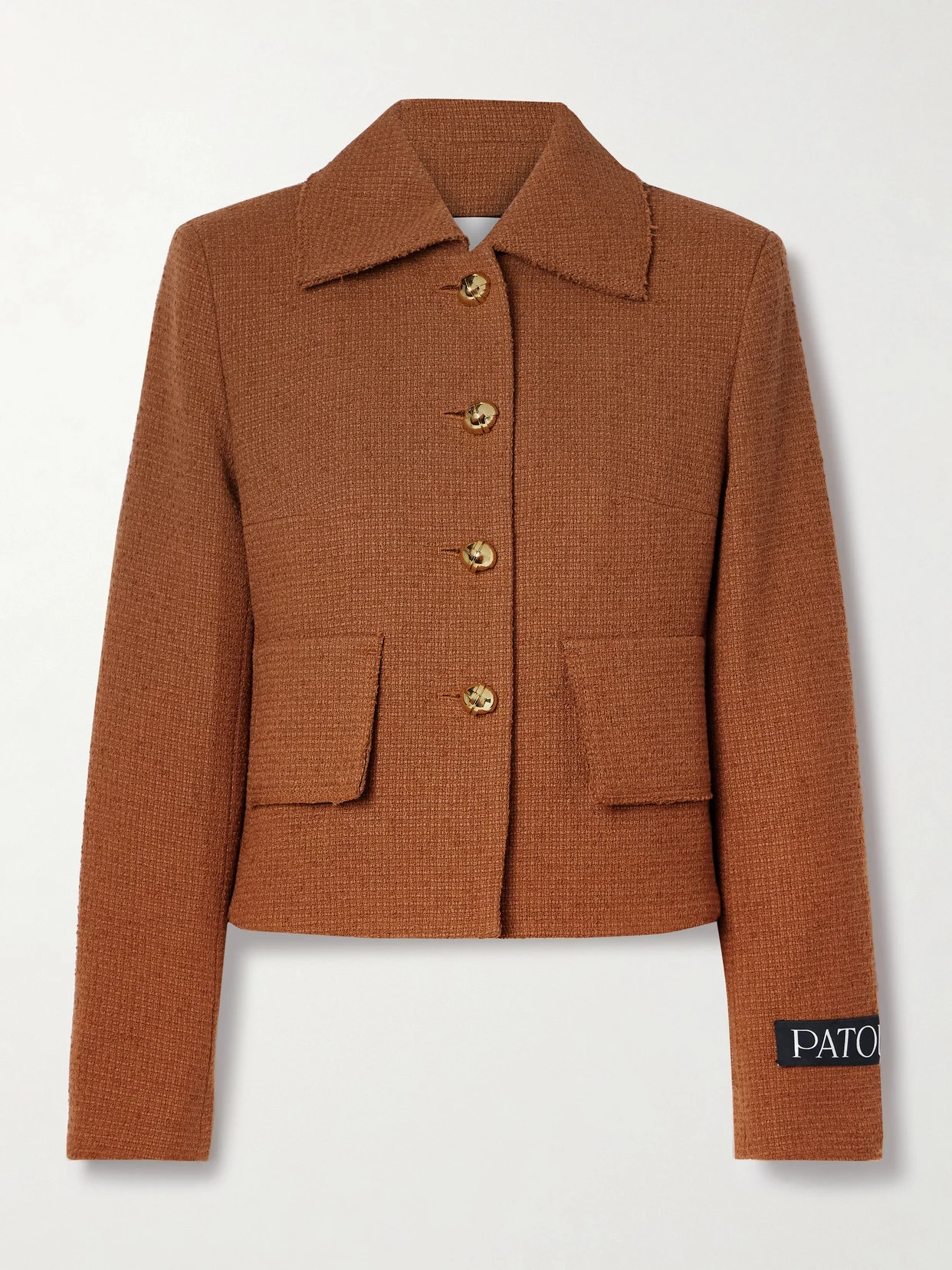 Patou's jacket is tailored from wool-blend tweed in a shade of brown the brand calls ‘Autumn Leaf', making it the perfect layering piece for fall. It's lined in smooth satin and features polished gold-tone buttons and a logo patch at the sleeve.