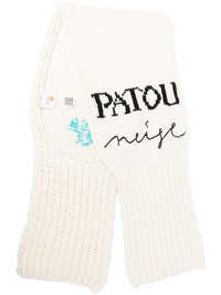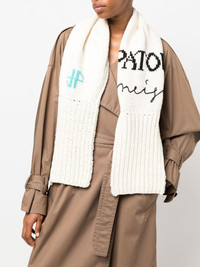 intarsia-knit virgin wool scarf intarsia-knit virgin wool scarf from Patou featuring ivory white, virgin wool, intarsia-knit logo, knitted construction and ribbed edge. Imported Composition Wool 100% SIZE & FIT Model measurements Height 5 ft 11 in(1.8 m) Bust/Chest 31.88 in(81 cm) Hips 35.03 in(89 cm) Waist 24.01 in(61 cm) Measurement LENGTH 62.99 in(160 cm) WIDTH 13.77 in(35 cm) Washing instructions Hand Wash