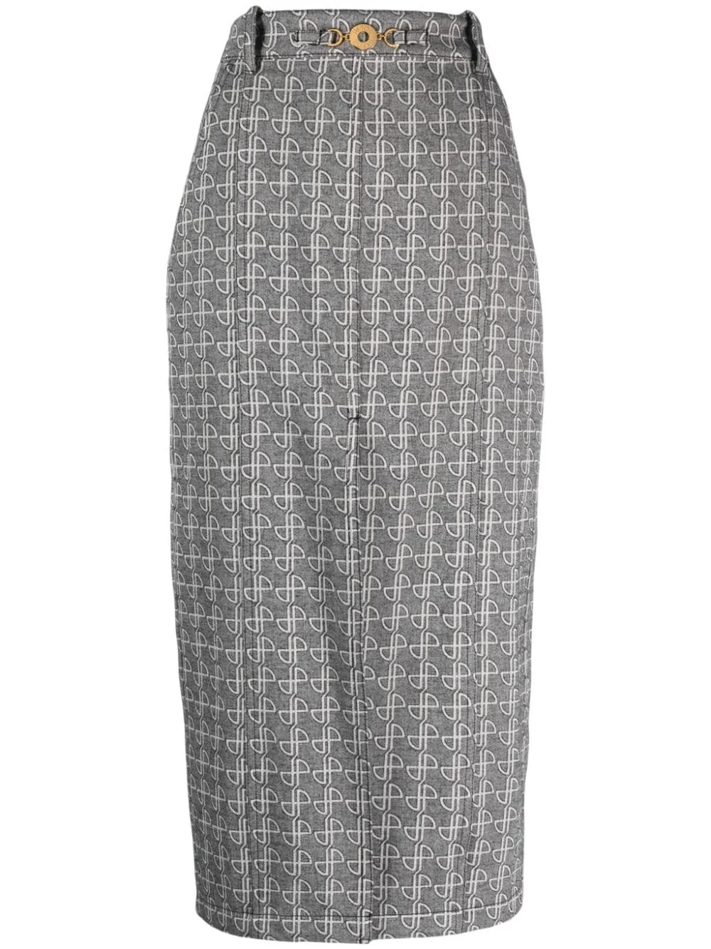JP monogram slit midi skirt Patou is recognised for its tasteful yet distinctive design style. This is shown with this skirt from the house’s AW23 collection as it arrives in a grey hue with the brand's signature PB monogram printed all over. Highlights - Cool grey - Cotton - Monogram pattern - Gold-tone logo plaque - High waist - Belt loops - Slip pockets to the sides - Concealed rear zip fastening - Front slit - Calf-length Imported Composition Cotton 100% SIZE & FIT Model measurements Height 5 ft 11 in(1.8 m) Bust/Chest 31.49 in(80 cm) Hips 35.82 in(91 cm) Waist 24.8 in(63 cm) Washing instructions Specialist Cleaning