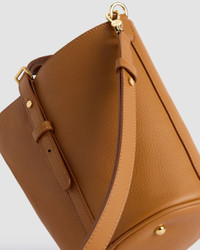 The Small JP Bucket Bag in Caramel by Patou is a classic bucket bag featuring a tonal Patou logo, pin buckle fastening, and adjustable shoulder strap. - Metal Feet - 100% Leather - #BA0165038811C