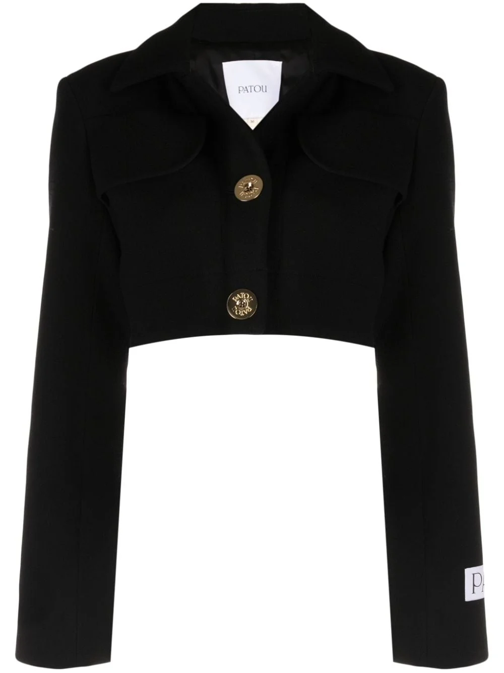 cropped wool blazer Highlights - Black - Virgin wool - Applique logo - Spread collar - Front button fastening - Long sleeves - Cropped Imported Composition Outer: Virgin Wool 100% Lining: Polyester 100% SIZE & FIT Model measurements Height 5 ft 10 in(1.77 m) Bust/Chest 31.49 in(80 cm) Hips 35.43 in(90 cm) Waist 25.19 in(64 cm) FittingInformation Designed for a boxy fit, intended for a loose fit throughout The internal shoulder pads offer a structured shape Made from a midweight non-stretch fabric This piece fits true to size – take your usual size Washing instructions Dry Clean Only