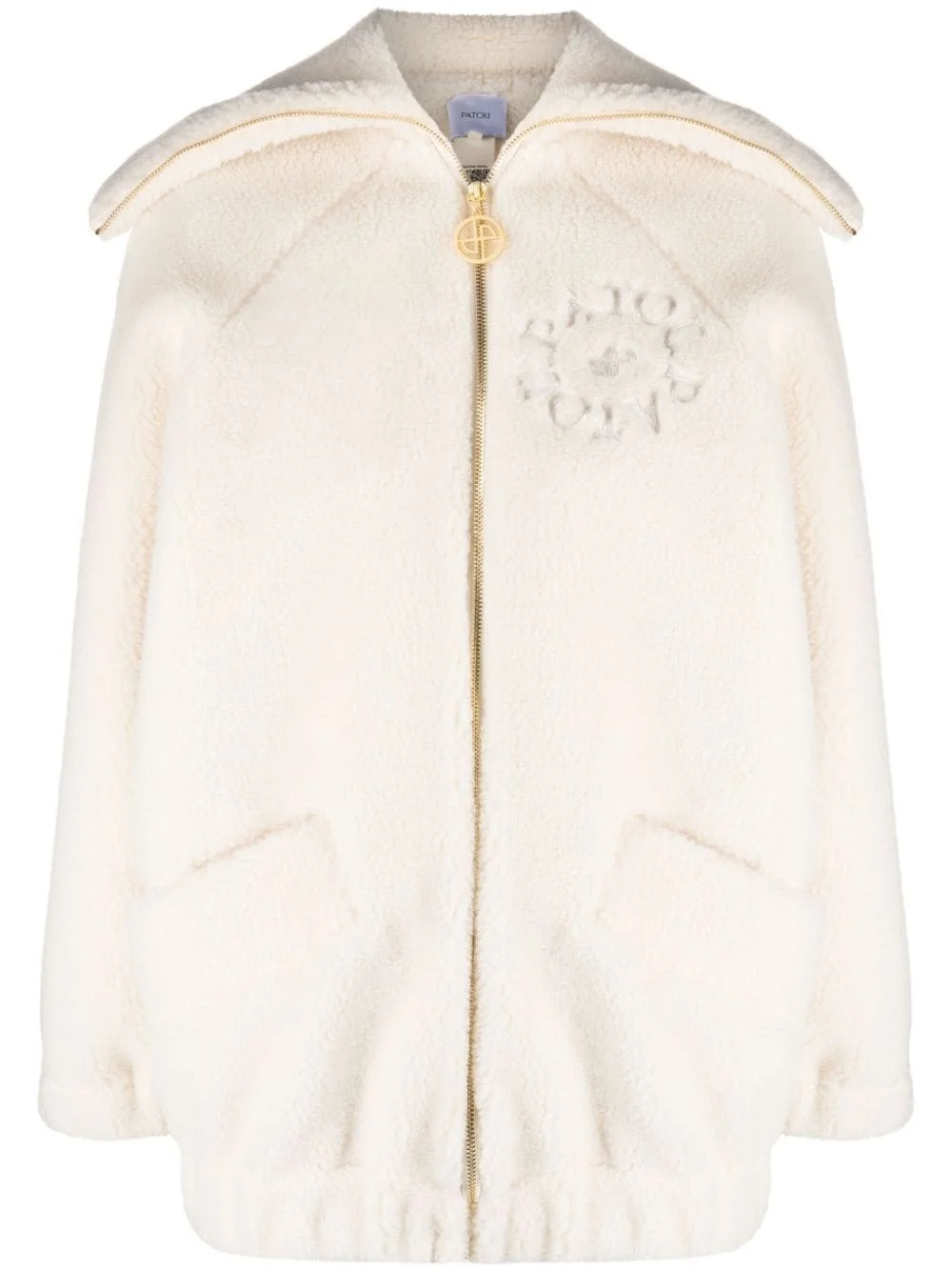 logo-embroidered fleece jacket Patou exhibits a sophisticated take on comfort dressing with this fleece jacket. Arriving in an Avalance white hue, it boasts a silhouette-defining spread collar and is finished with an embroidered logo at the chest. Highlights - Off-white - Fleece texture - Spread collar - Front zip fastening - Gold-tone hardware - Logo charm - Embroidered logo at the chest - Long sleeves - Two side inset pockets - Straight hem Imported Composition Polyester 82%, Cotton 18% SIZE & FIT Model measurements Height 5 ft 10 in(1.78 m) Bust/Chest 31.49 in(80 cm) Hips 37 in(94 cm) Waist 23.62 in(60 cm) Measurement CHEST 42.51 in(108 cm) SLEEVE LENGTH 29.13 in(74 cm) LENGTH 30.31 in(77 cm) FittingInformation Designed to be unstructured, offering a loose fit throughout The elasticated hem allows for movement and a comfortable fit Made from a midweight non-stretch fabric, this piece offers minimal elasticity when worn This piece fits true to size – take your usual size Washing instructions Dry Clean Only