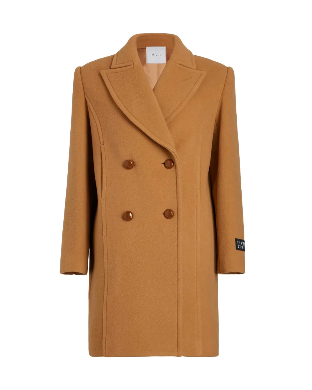 The Soft Tailored Coat in Biscuit by Patou is a double breasted jacket featuring wide peak lapels, woven leather buttons, and Patou label on the left sleeve. - 72% wool, 25% nylon, 3% cashmere - Lining: 100% viscose - Made in Romania - CO0250183109B
