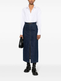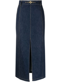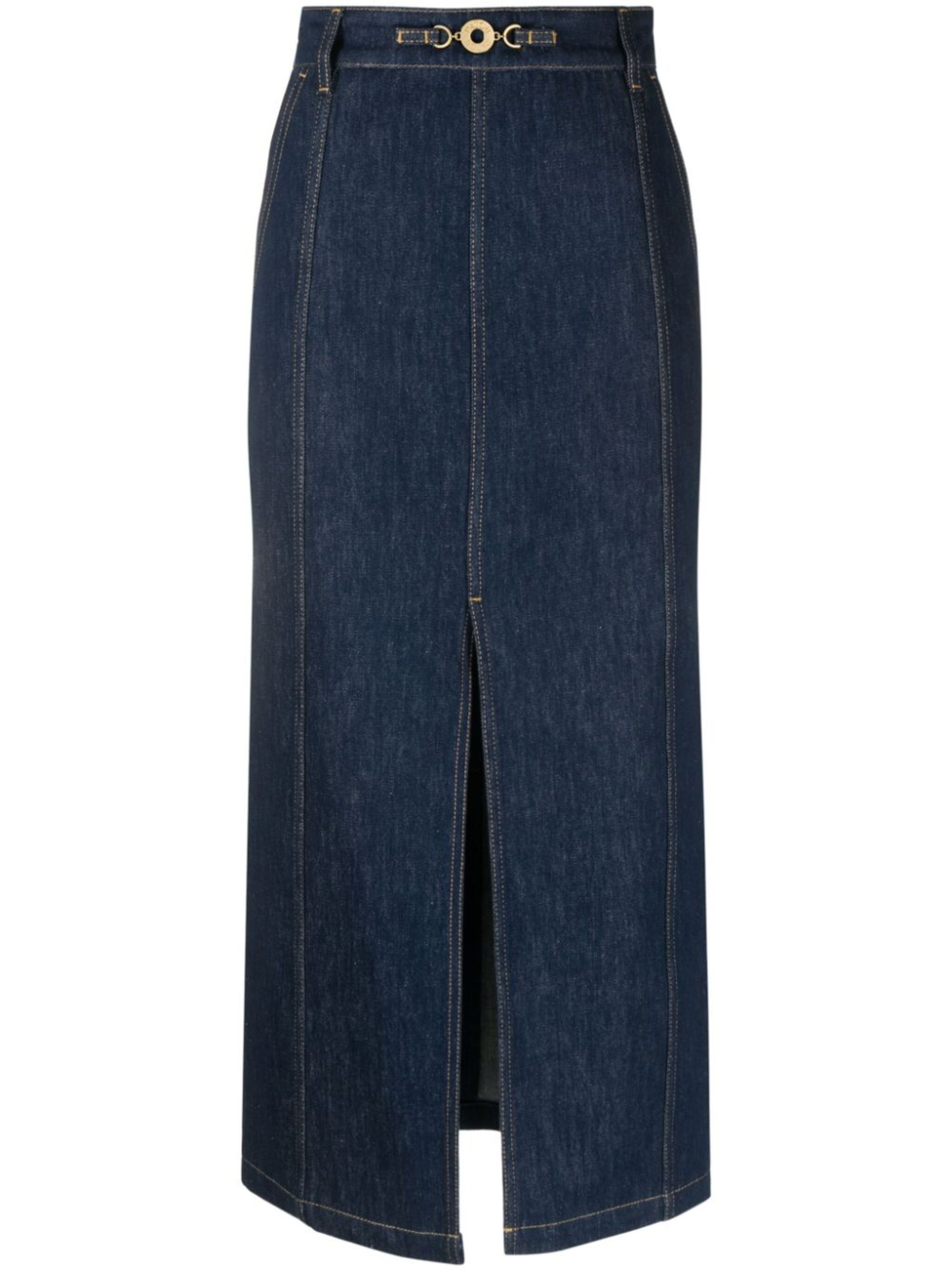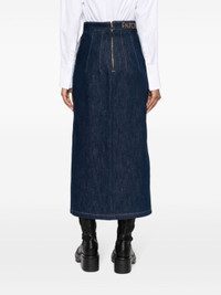 midnight blue cotton blend denim logo charm high-waisted belt loops rear zip fastening two side slit pockets front slit mid-length straight hem Size & Fit Model Measurements: Height: 1.78 m Bust/Chest: 80.0 cm Hips: 92.0 cm Waist: 61.0 cm Model wears size 36 Fabric and Care Designer Style ID: SK0500008602D Designer Colour: 602D RODEO BLUE Composition: Zamac 100%, Cotton 92%, Polyester 8% Washing instructions: Machine Wash Made in Tunisia