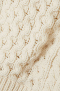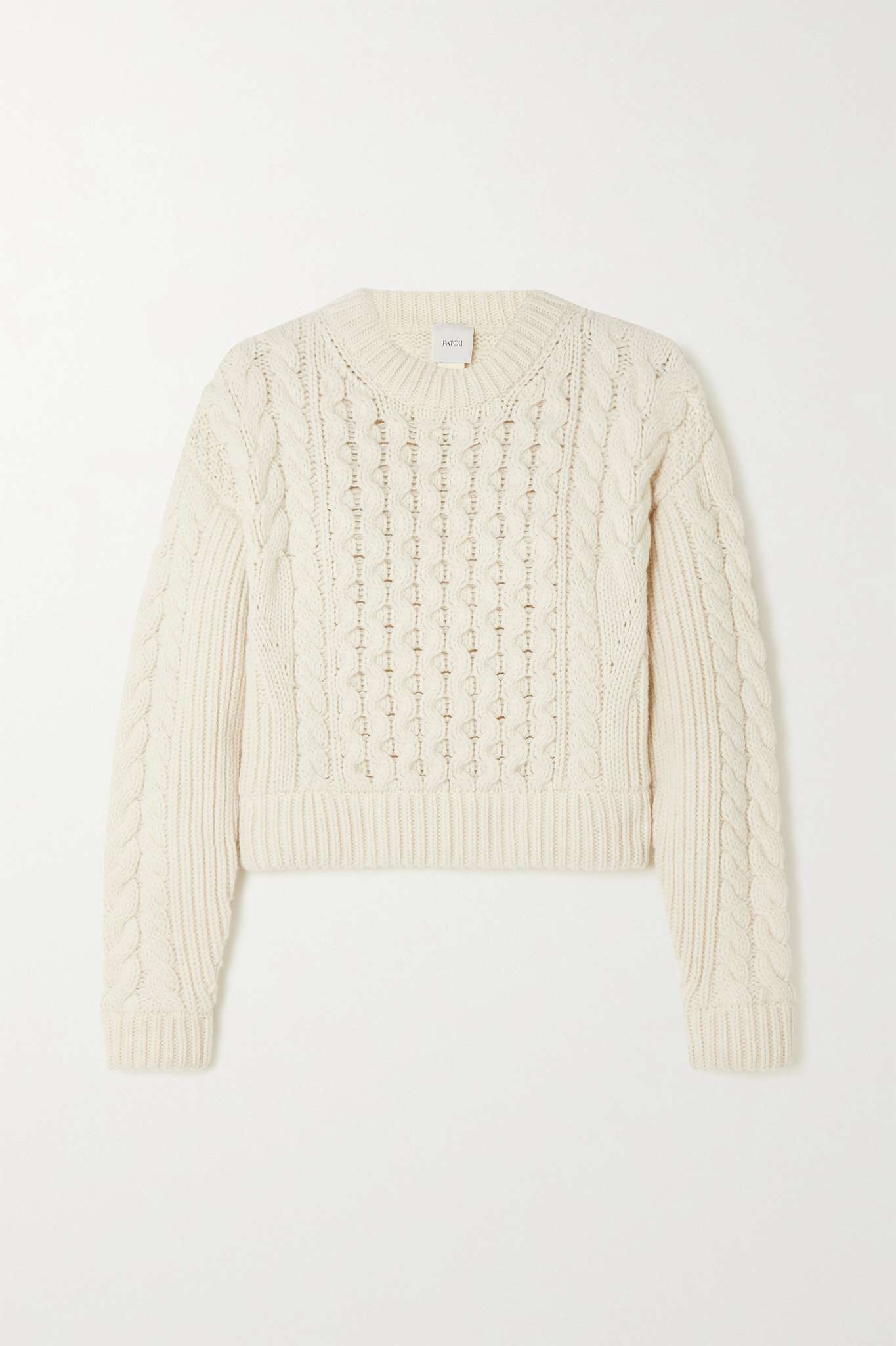 EDITORS'NOTES Patou's cropped sweater stays true to traditional Aran styles and is every bit as timeless. It's spun from sumptuous wool using a mix of honeycomb, cable and ribbed stitches for warmth and tactility. The classic 'Avalanche' shade makes styling so easy. SIZE & FIT - Fits true to size, take your normal size - Designed for a slightly loose fit - Cropped length - Chunky knit - Model is 180cm/ 5’11” and is wearing a size Small DETAILS & CARE - Off-white wool - Slips on - 100% wool - Designer color: Avalanche