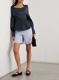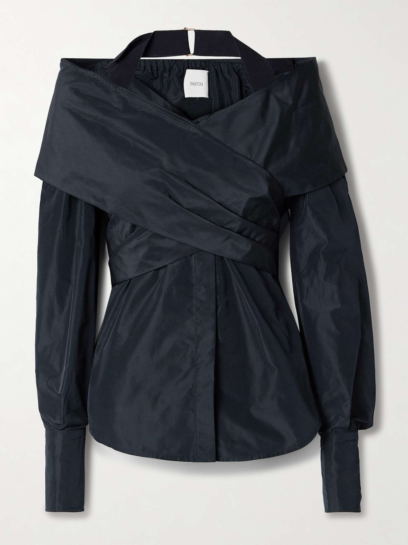 Off-the-shoulder wrap-effect sateen blouse Navy