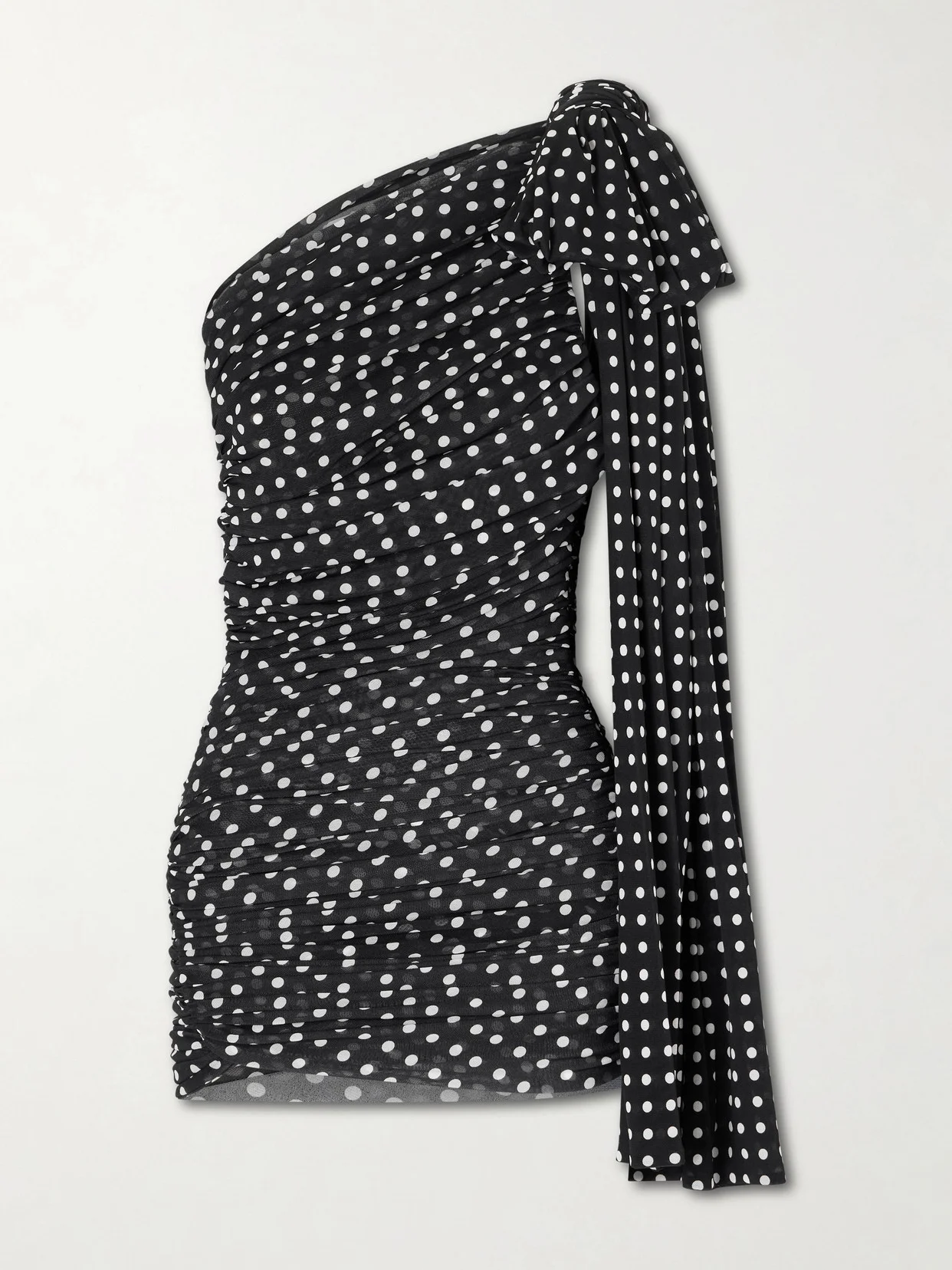 One-shoulder Draped Polka-dot Jersey Mini Dress