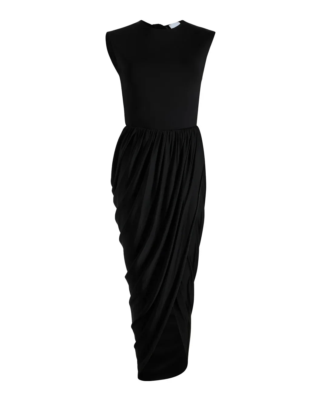 FINAL SALE The Open Back Dress in Black by Patou is a draped midi dress featuring an elasticated waist, draped skirt with elasticated waist, and front slit. - 100% Rayon - #JE1479973999B