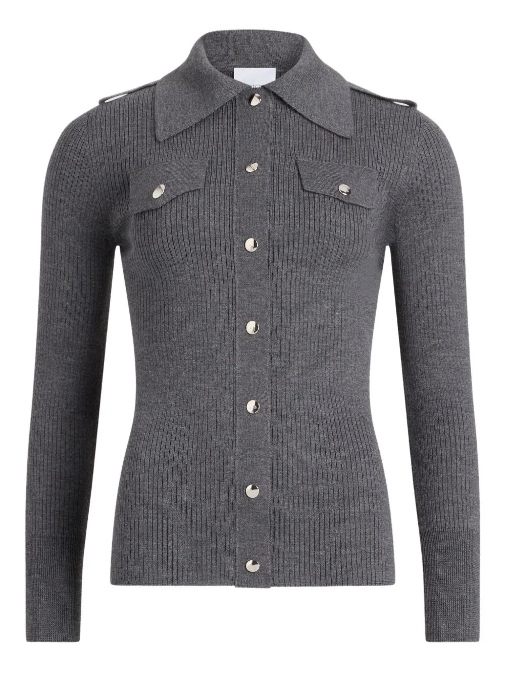 ribbed collared cardigan Highlights - Grey - Ribbed knit - Collared neckline - Button fastening - Shoulder straps - Long sleeves Imported Composition Outer: Merino 100% Washing instructions Read Manufacturer Guidelines