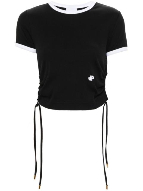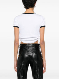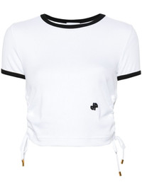 ribbed-knit cut-out T-shirt Patou enlivens a classic white T-shirt silhouette with this stretch iteration, defined by a gathered cut-out at the side. It's complete with a contrasting trim and logo embroidery. Highlights - Off-white - Stretch-cotton - Ribbed knit - Contrasting trim - Round neck - Short sleeves - Chenille logo patch - Cut-out detailing at the sides - Side drawstring fastening - Straight hem Imported Composition Cotton 98%, Elastane 2% SIZE & FIT Model measurements Height 5 ft 9 in(1.76 m) Bust/Chest 31.88 in(81 cm) Hips 35.43 in(90 cm) Waist 24.8 in(63 cm) FittingInformation Designed for a slim fit that sits just away from the body offering a close yet comfortable fit Made from a midweight stretch fabric, this piece offers elasticity and flexibility when worn This piece fits true to size – take your usual size