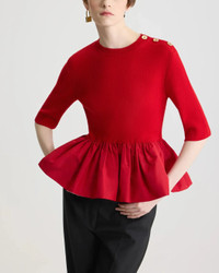 The Ruffle Hem Ribbed Jumper in Wool and Faille in Elixir Red by Patou is a fitted, mock neck blouse featuring a faille ruffle hem, mid length sleeves, and gold-tone JP-engraved buttons on the shoulder. Perfect for an evening dinner paired back to a tailored trouser. The model wears a size 36 - S.