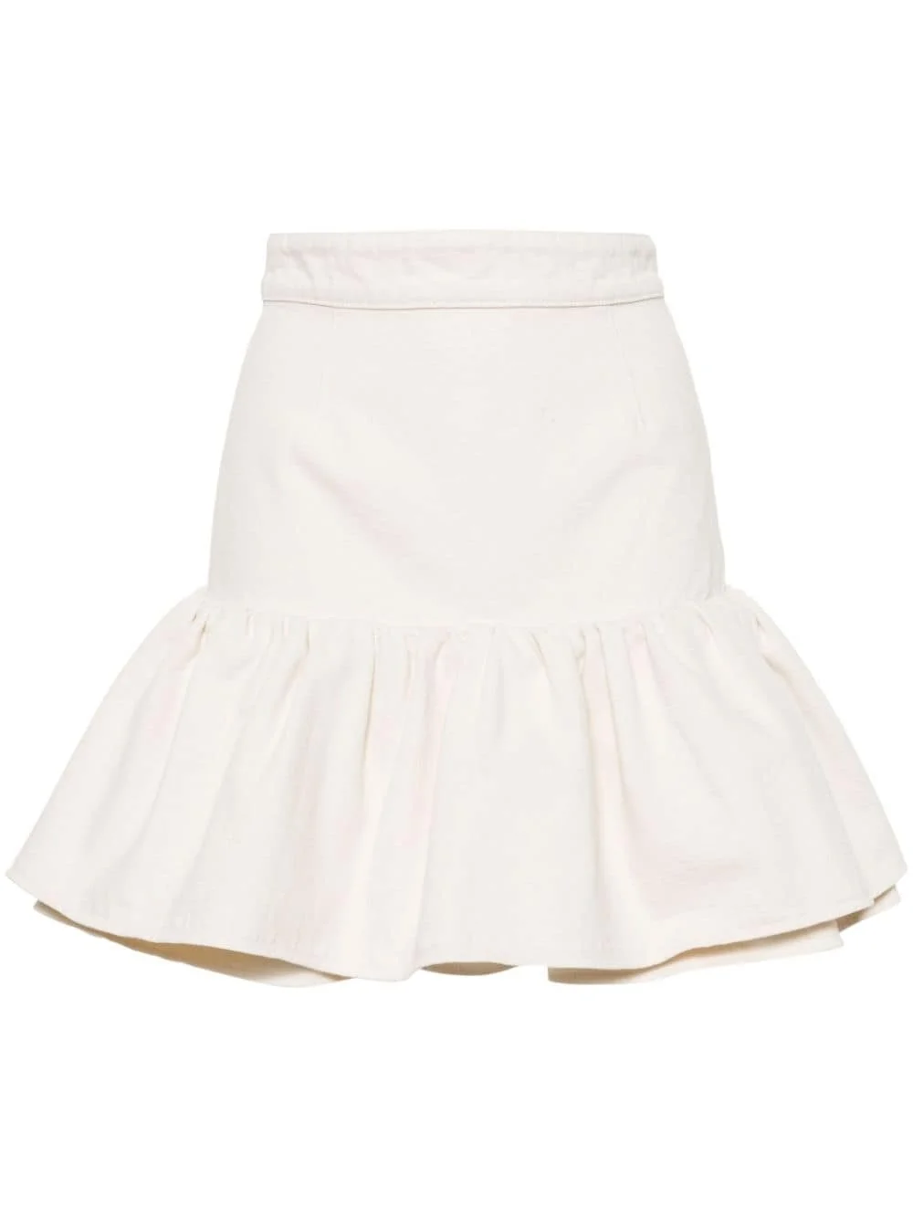 ruffled denim miniskirt Patou’s Guillaume Henry draws from the sartorial scenes of the Sunday evening clubs he used to attend in Paris to inspire this skirt. It’s cut from white cotton to hold the ruching and volume of the ruffled hem. Highlights - Ecru - Cotton - Canvas - Embroidered logo to the rear - High-rise - Concealed rear zip fastening - Branded zip puller - Double layer ruffle hem - Thigh-length Imported Composition Cotton 100% SIZE & FIT Model measurements Height 5 ft 11 in(1.8 m) Bust/Chest 31.49 in(80 cm) Hips 36.61 in(93 cm) Waist 24.4 in(62 cm) FittingInformation This mini-length skirt is intended to be worn high on the waist Made from a midweight non-stretch fabric This piece fits true to size – take your usual size