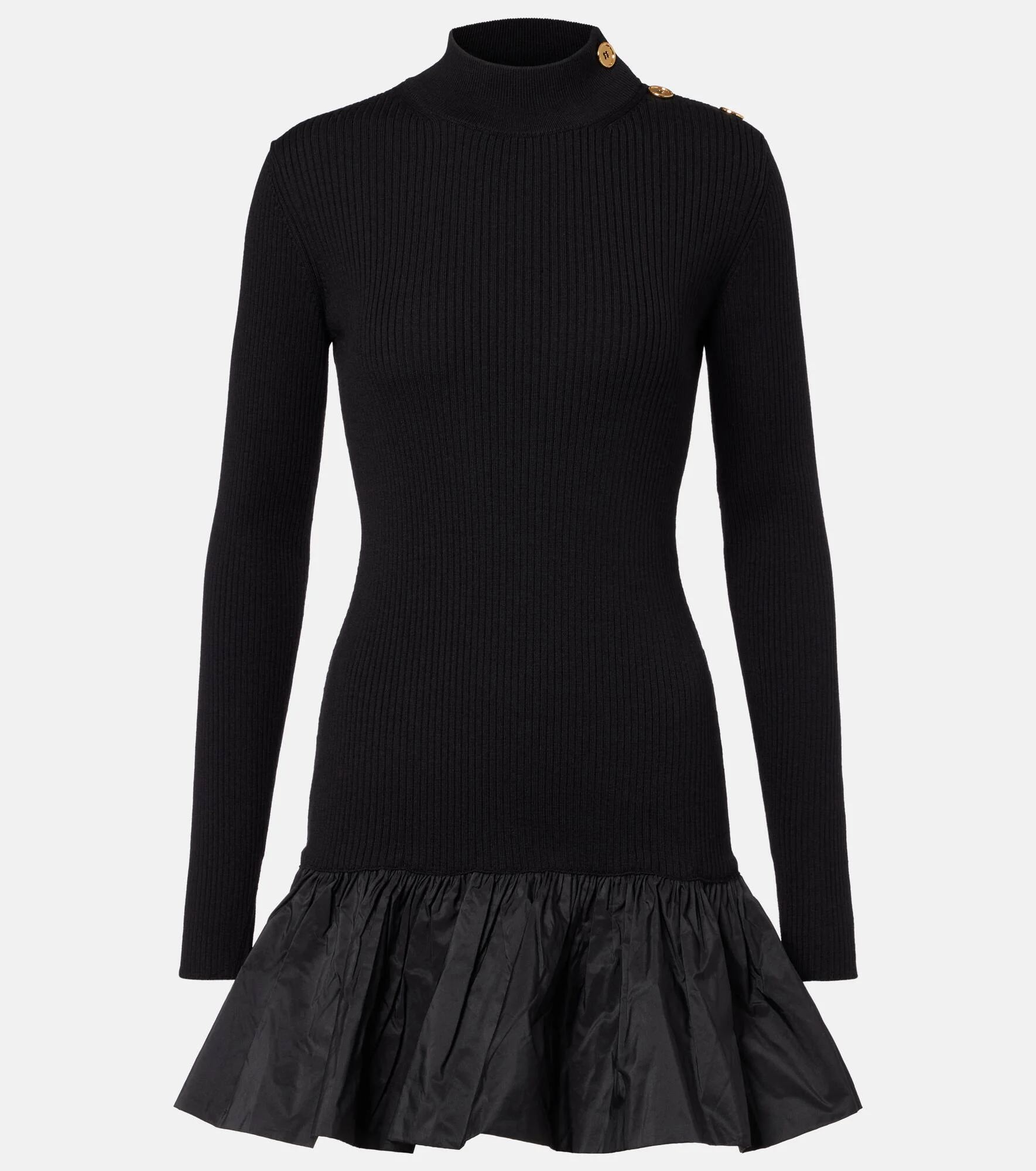 Rib-knit in wool, this minidress from Patou is designed with a fitted silhouette and a charming faille ruffled hem. The piece features a mock neck, gold-toned engraved shoulder buttons, and elongated split-cuff long sleeves. Product Details - Material: 100% wool (merino wool) - Care instructions: dry clean - Made in Turkey - Designer color name: Black - Item color: black - Material II: 100% polyester - Cuff: ribbed - Closure: buttoned shoulder - Item number: P01066278 Size & Fit - True to size - Fitted - Partly stretchy fabric - The model seen in the picture is 178cm-5'10" and wearing a size XS