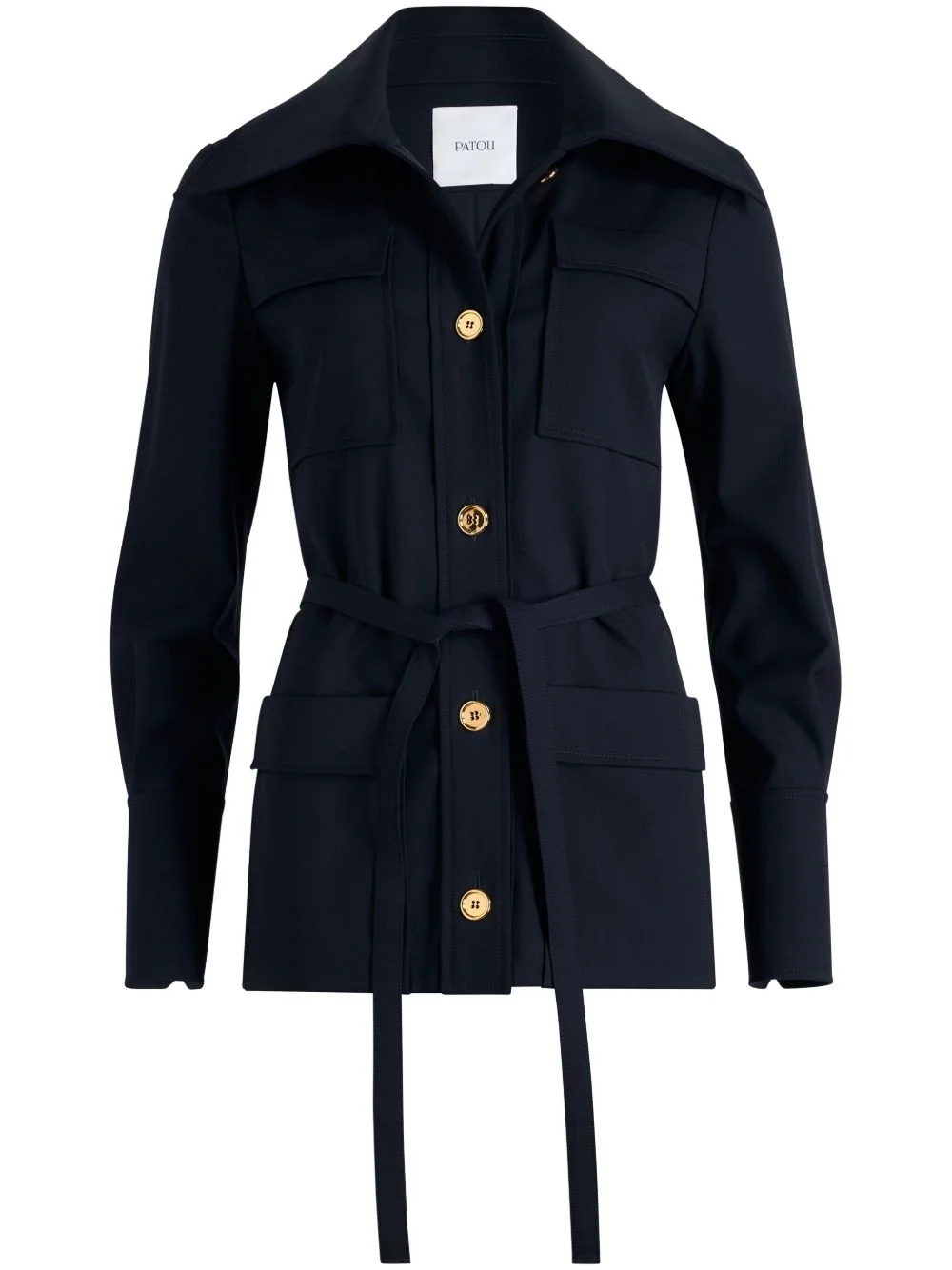 Safari twill jacket Highlights - Navy blue - Front button fastening - Tied waist - Four front flap pockets - Buttoned cuffs Imported Composition Wool 100% Washing instructions Dry Clean Only