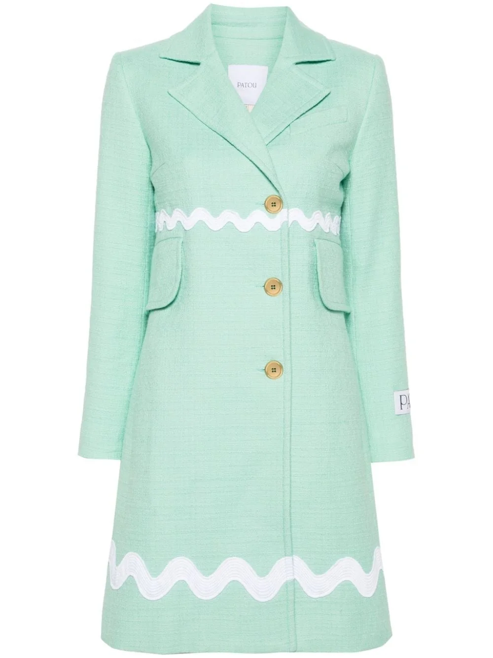 Wave tweed coat Highlights - Mint green - Cotton blend - Tweed - Notched lapels - Shoulder pads - Chest welt pocket - Long sleeves with concealed buttoned cuffs - Logo patch at the sleeve - Scallop trim detail - Two side flap pockets - Two side inset pockets - Above-knee length - Straight hem - Central rear vent - Full lining - Gold-tone buttons - Double-breasted button fastening Imported Composition Polyester 100%, Cotton 97%, Polyamide 2%, Elastane 1% SIZE & FIT Model measurements Height 5 ft 11 in(1.8 m) Bust/Chest 33.07 in(84 cm) Hips 37 in(94 cm) Waist 25.59 in(65 cm) Measurement CHEST 33.85 in(86 cm) SLEEVE LENGTH 24.4 in(62 cm) HIPS 39.37 in(100 cm) LENGTH 37 in(94 cm) WAIST 33.07 in(84 cm) FittingInformation Designed for a slim fit that sits just away from the body offering a close yet comfortable fit The internal shoulder pads offer a structured shape Made from a midweight non-stretch fabric This piece fits true to size – take your usual size