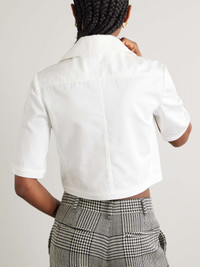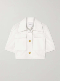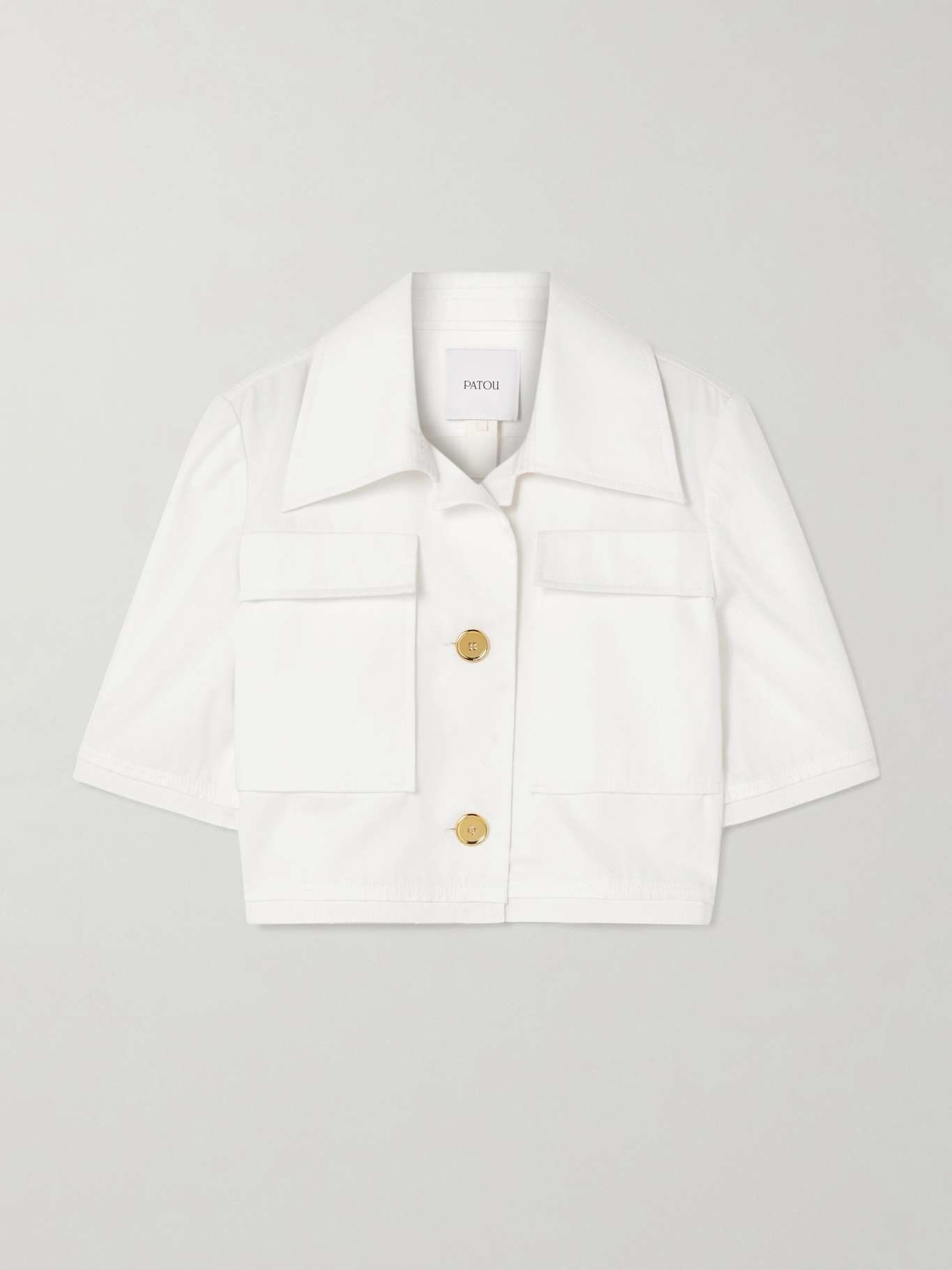 Patou embodies the spirit of Parisian elegance. Tailored from cotton-twill, this short-sleeve jacket has a loose shape with dramatic chest flap pockets and logo-embossed gold-tone buttons. Complement the cropped hem with high-rise jeans or tailoring. Size & Fit - Fits true to size, take your normal size - Designed for a loose fit - Cropped length - Mid-weight, non-stretchy fabric - Model is 180cm/ 5'11" and is wearing a FR 36 Model measurements: - Bust: 80cm/ 31.5" - Waist: 65cm/ 25.5" - Hip: 89cm/ 35" Details & Care - White cotton-twill - Button fastenings through front - 100% cotton