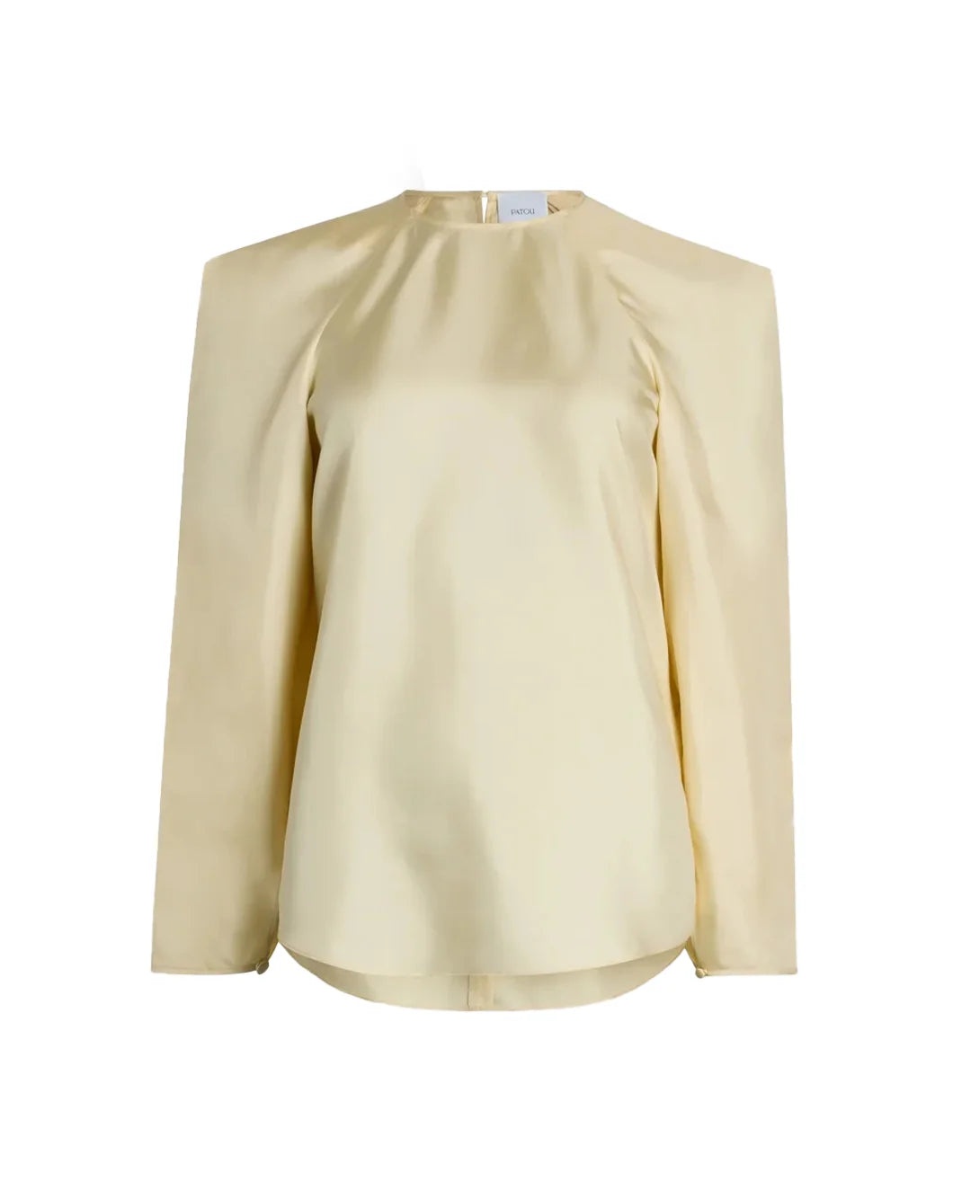 The Square Shoulder Top in Organic Silk by Patou is an off white blouse featuring a rounded neckline, square shoulder, and raglan sleeves creating a striking silhouette. - 100% organic silk - Button fastening at the back and cuffs - Made in Portugal - TO0470191116B