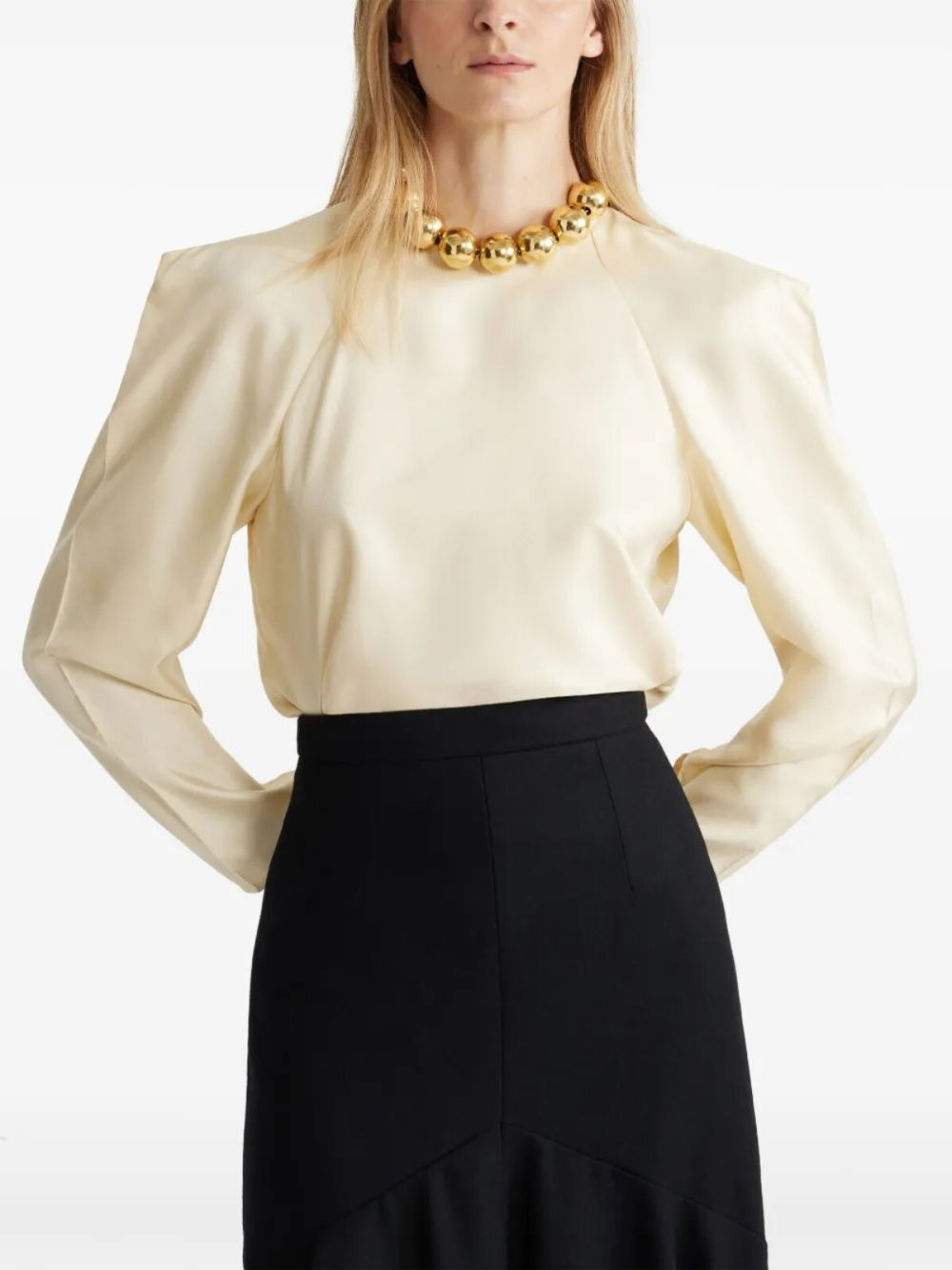 shoulder-pad blouse Highlights - Sand beige - Organic silk - Shoulder pads - Round neck - Keyhole detail to the rear - Single rear button fastening - Long sleeves - Buttoned-cuff sleeves - Curved hem - This item is made from at least 50% organic materials. - Learn more about what makes a product conscious on our conscious criteria page Imported Composition Organic Silk 100%