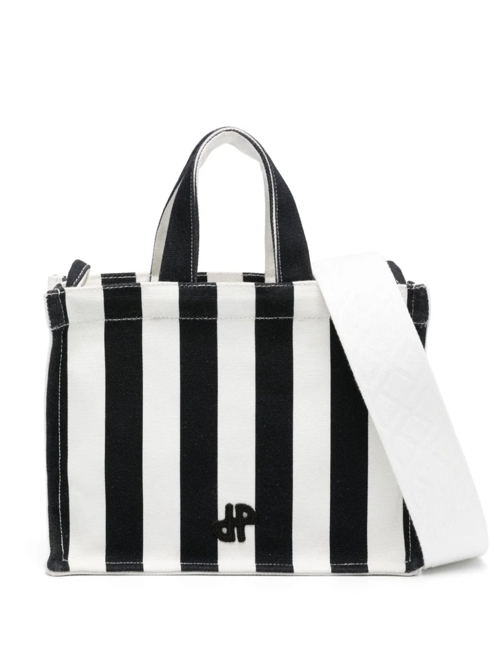 small JP canvas tote bag Patou’s JP handbag family pays homage to its eponymous founder – the applique at the front of this small tote is formed from his initials. It’s crafted from durable cotton canvas to a structural silhouette and enlivened with black and white stripes. The wide shoulder strap is woven with a diamond motif for a subtle clash of pattern. Highlights - White/black - Cotton - Canvas - Vertical stripe print - Applique logo - Open top - Detachable jacquard shoulder strap - Two flat top handles - Main compartment - Internal logo tag - Unlined - Gold-tone hardware Imported Composition Outer: Cotton 100%, Polyester 100% SIZE & FIT Model measurements Height 5 ft 11 in(1.8 m) Bust/Chest 33.07 in(84 cm) Hips 37.4 in(95 cm) Waist 25.19 in(64 cm) Measurement DEPTH 3.93 in(10 cm) HANDLE 3.93 in(10 cm) HEIGHT 7.48 in(19 cm) STRAP 40.15 in(102 cm) WIDTH 9.84 in(25 cm)