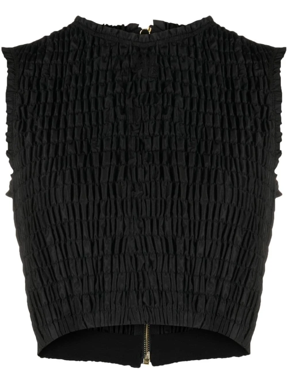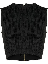 smock-detail crop top Patou's graceful Parisian style is showcased through the meticulous smock detailing on this sleeveless cropped top. Highlights - Black - Smocking details - Round neck - Sleeveless - Rear zip fastening - Straight hem - Cropped Imported Composition Polyester 100% SIZE & FIT Model measurements Height 5 ft 11 in(1.8 m) Bust/Chest 31.49 in(80 cm) Hips 35.43 in(90 cm) Waist 24.4 in(62 cm) FittingInformation Designed for a slim fit that sits just away from the body offering a close yet comfortable fit Cropped in length Made from a midweight non-stretch fabric, this piece offers minimal elasticity when worn This piece fits true to size – take your usual size Washing instructions Hand Wash