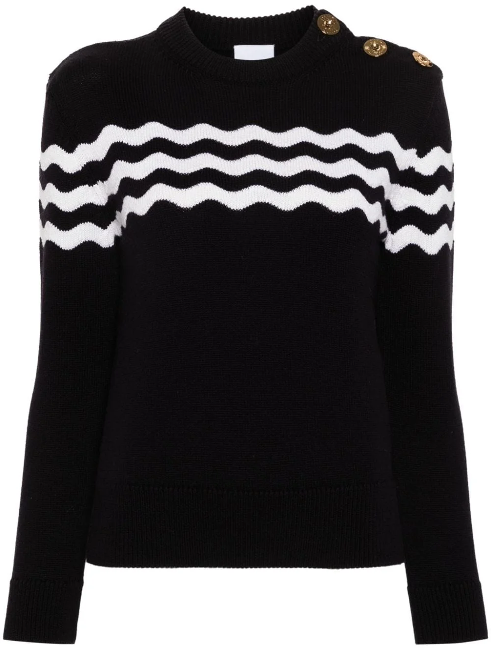 Wave knitted jumper Highlights - Navy blue/white - Cotton-wool blend - Knitted construction - Crew neck - Waves motif - Long sleeves - Ribbed cuffs and hem - Straight hem - Button fastening at the shoulder Imported Composition Cotton 60%, Merino 40% SIZE & FIT Model measurements Height 5 ft 9 in(1.75 m) Bust/Chest 34.64 in(88 cm) Hips 36.61 in(93 cm) Waist 26.37 in(67 cm) FittingInformation Designed for a relaxed fit, this piece allows for comfort and movement when worn The ribbed hem offers a close, comfortable fit Made with a midweight knit, this piece offers some stretch This piece fits true to size – take your usual size