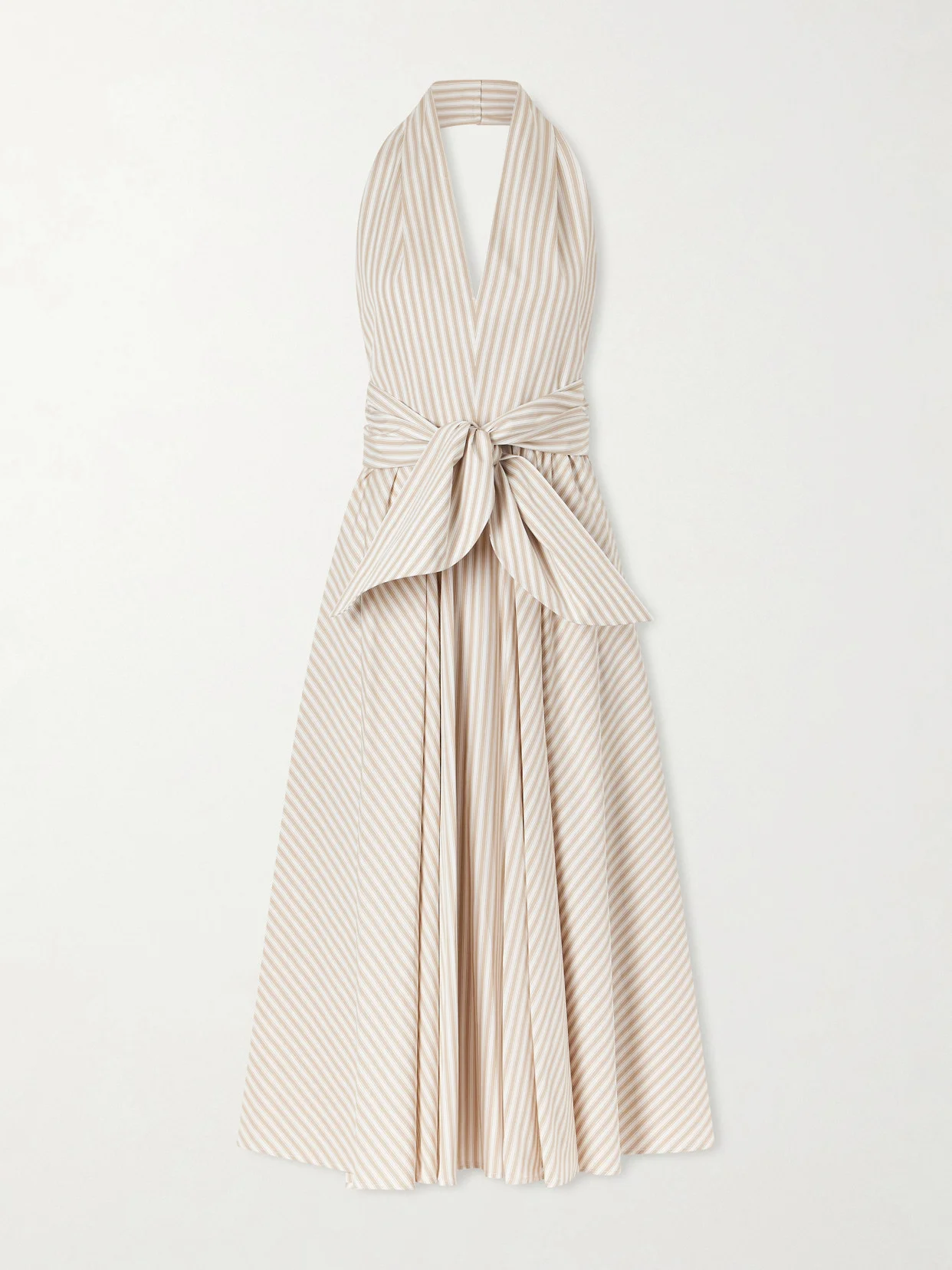 Patterned with subtle brown and white stripes, Patou's dress evokes the ease of sunlit days. Made from cotton-poplin, it has a plunging halterneck that frames the open back and a knotted waist before falling to a full midi skirt.
