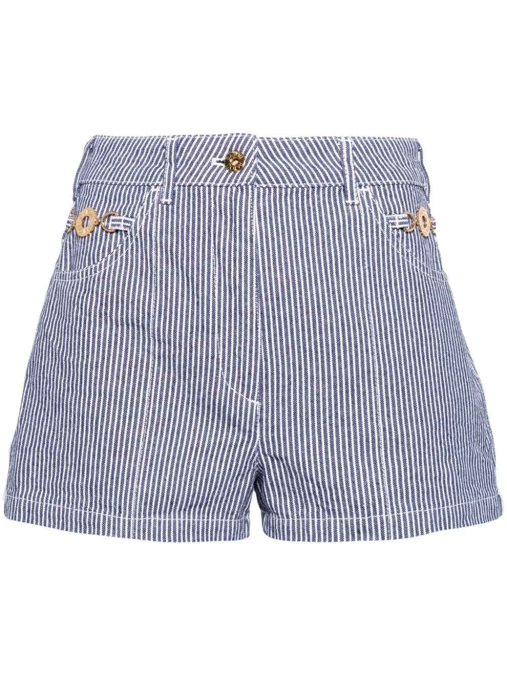 striped denim mini shorts Highlights - Navy blue/off-white - Cotton - Vertical stripe print - Decorative button detailing - Logo print to the rear - High-rise - Belt loops - Concealed fly and button fastening - Two side slit pockets Imported Composition Cotton 100% SIZE & FIT Model measurements Height 5 ft 9 in(1.76 m) Bust/Chest 29.13 in(74 cm) Hips 33.07 in(84 cm) Waist 22.83 in(58 cm) FittingInformation Designed for a close fit throughout Slightly short in length; consider your own measurements Sturdy and hard-wearing, this denim piece offers no stretch This piece fits true to size – take your usual size Washing instructions Machine Wash