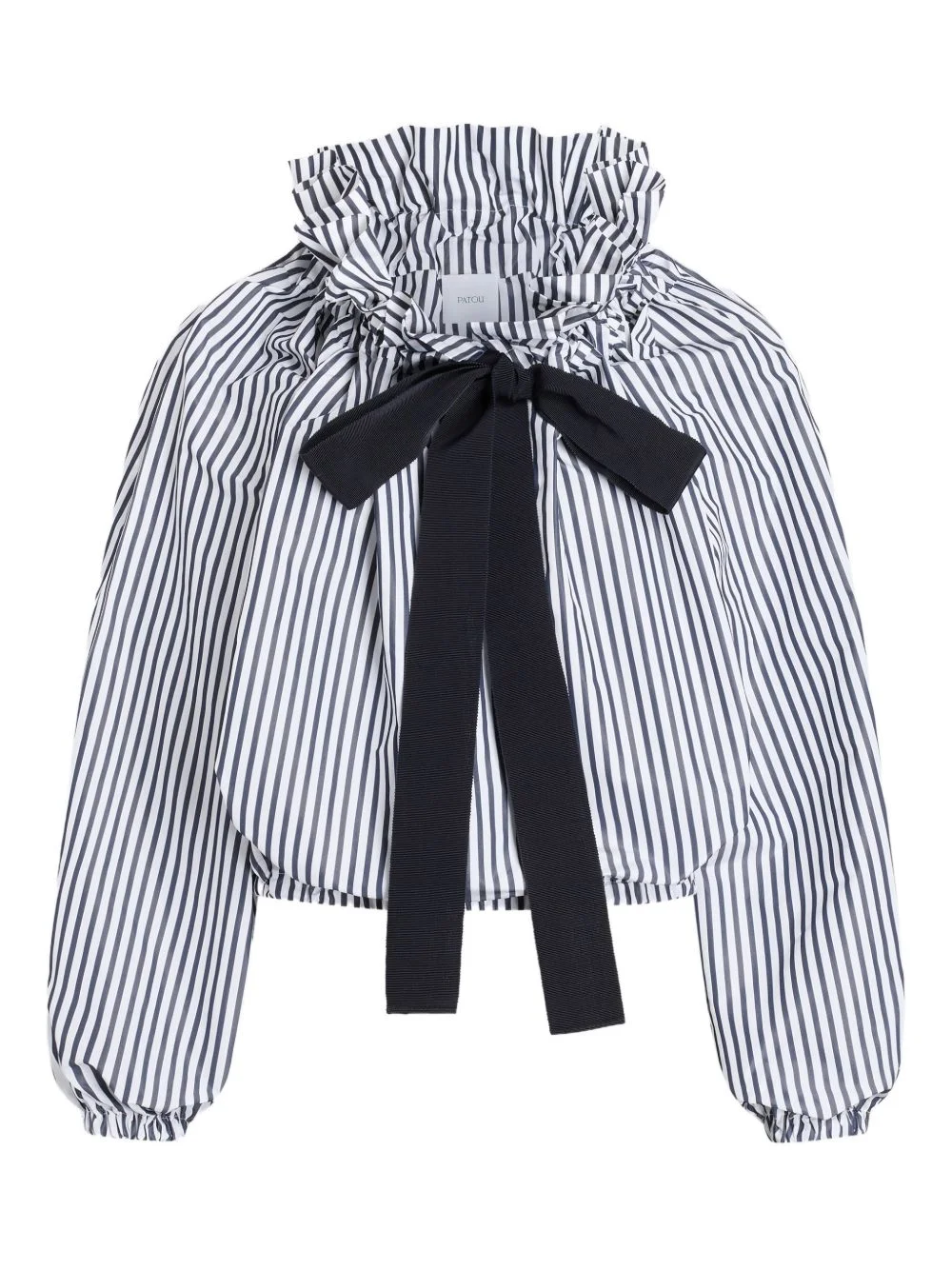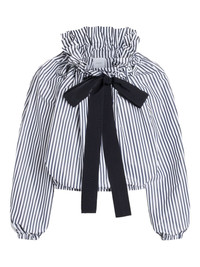 striped ruffled-neck bow-tie blouse Highlights - Dark blue and white - Striped pattern - Black bow - Ruffled neck - Long sleeves - Elasticated hem Imported Composition Recycled Polyester 100% Washing instructions Hand Wash