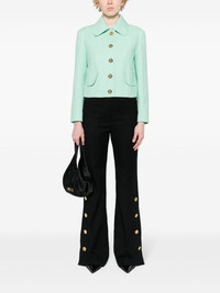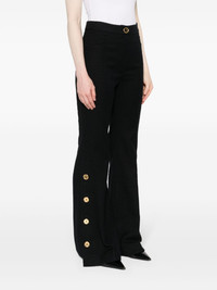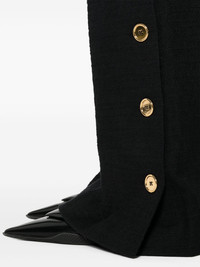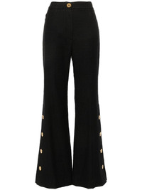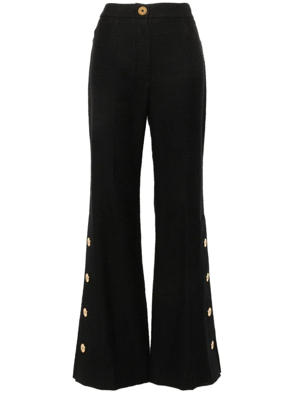 tweed flared trousers Highlights - Black - Cotton blend - Tweed - Faux pocket detail - Pressed crease - Side button fastening - Flared hem - Concealed fly and button fastening Imported Composition Cotton 97%, Polyamide 2%, Elastane 1% SIZE & FIT Model measurements Height 5 ft 9 in(1.75 m) Bust/Chest 34.64 in(88 cm) Hips 36.61 in(93 cm) Waist 26.37 in(67 cm) FittingInformation Designed with a flared hem, these trousers allow for a close fit at the waist with a slim fit over the leg and widening towards the hem Particularly long in length; consider your own measurements Made from a midweight stretch fabric, this piece offers elasticity and flexibility when worn This piece fits true to size – take your usual size