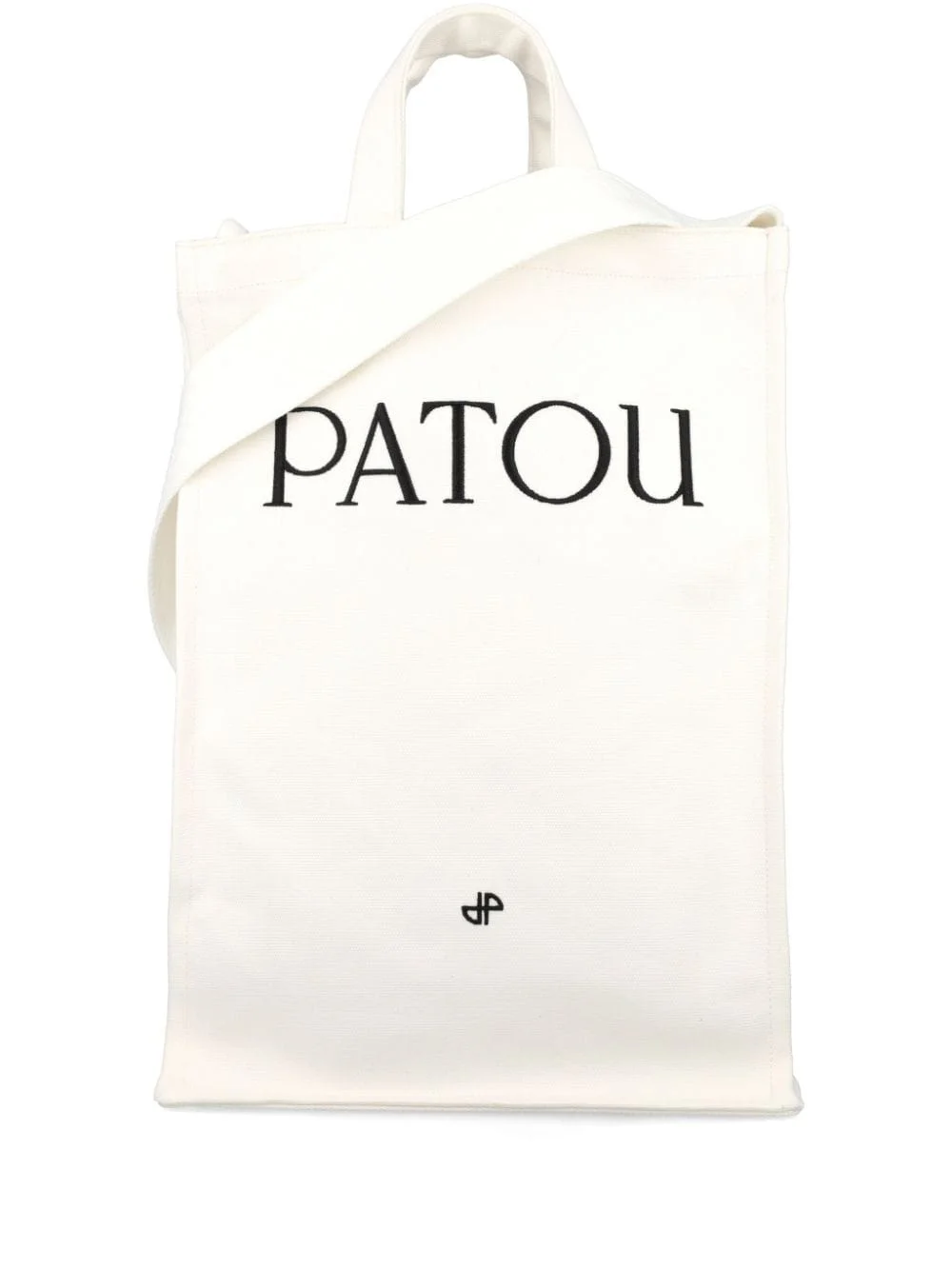 logo-print vertical tote bag Patou's famous logo takes the focus of this vertical tote bag. The detail appears printed at the front in black, contrasting with its cream-white cotton construction. Highlights - Cream white - Cotton - Logo print to the front - Single shoulder strap - Two top handles - Main compartment Imported Composition Outer: Cotton 100%