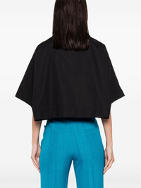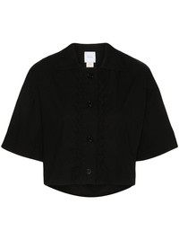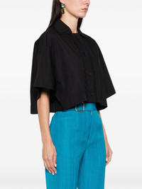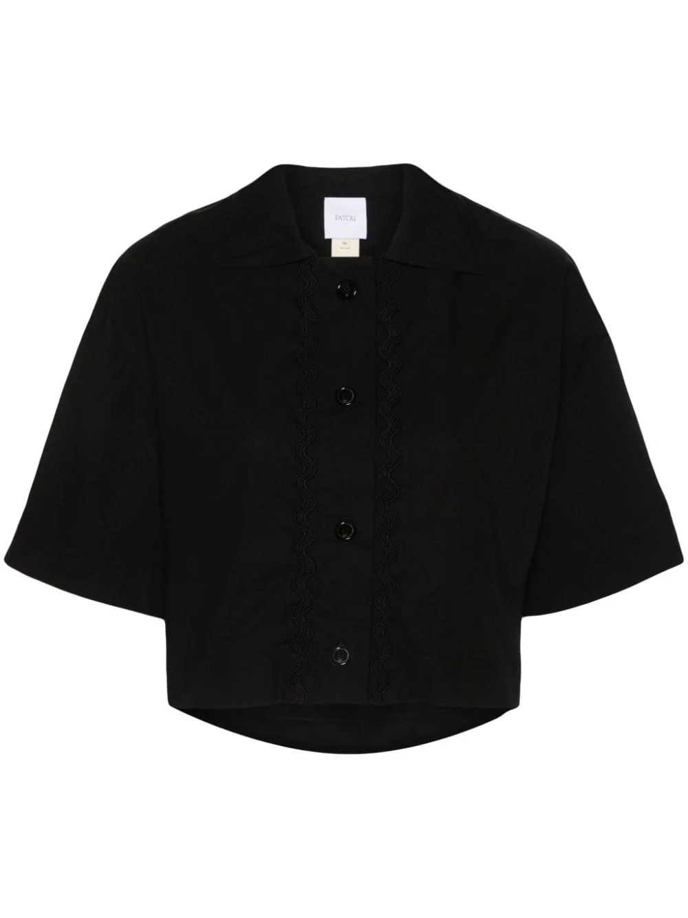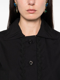 Wave cropped shirt Highlights - Black - Cotton - Poplin texture - Spread collar - Wave applique detail - Short sleeves - Cropped - Pleat detailing to the rear - Straight hem - Front button fastening Imported Composition Polyester 100%, Cotton 100% SIZE & FIT Model measurements Height 5 ft 10 in(1.78 m) Bust/Chest 33.46 in(85 cm) Hips 36.22 in(92 cm) Waist 23.22 in(59 cm) FittingInformation Designed for a boxy fit, intended for a loose fit throughout Cropped in length Made from a midweight non-stretch fabric This piece fits true to size – take your usual size