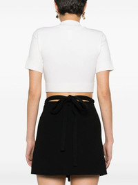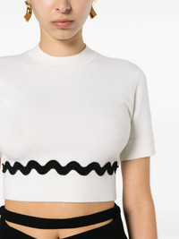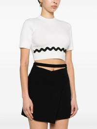 Wave cropped sweater Highlights - Cream white - Merino wool blend - Fine knit - Crew neck - Ribbed trims - Short sleeves - Contrasting scallop trim detail - Cropped - Straight hem - Pull-on style Imported Composition Polyester 100%, Merino 82%, Polyamide 18% SIZE & FIT Model measurements Height 5 ft 11 in(1.8 m) Bust/Chest 33.07 in(84 cm) Hips 37 in(94 cm) Waist 25.59 in(65 cm) FittingInformation Designed for a relaxed fit, this piece allows for comfort and movement when worn Cropped in length Made with a midweight knit, this piece offers some stretch This piece fits true to size – take your usual size Washing instructions Dry Clean Only