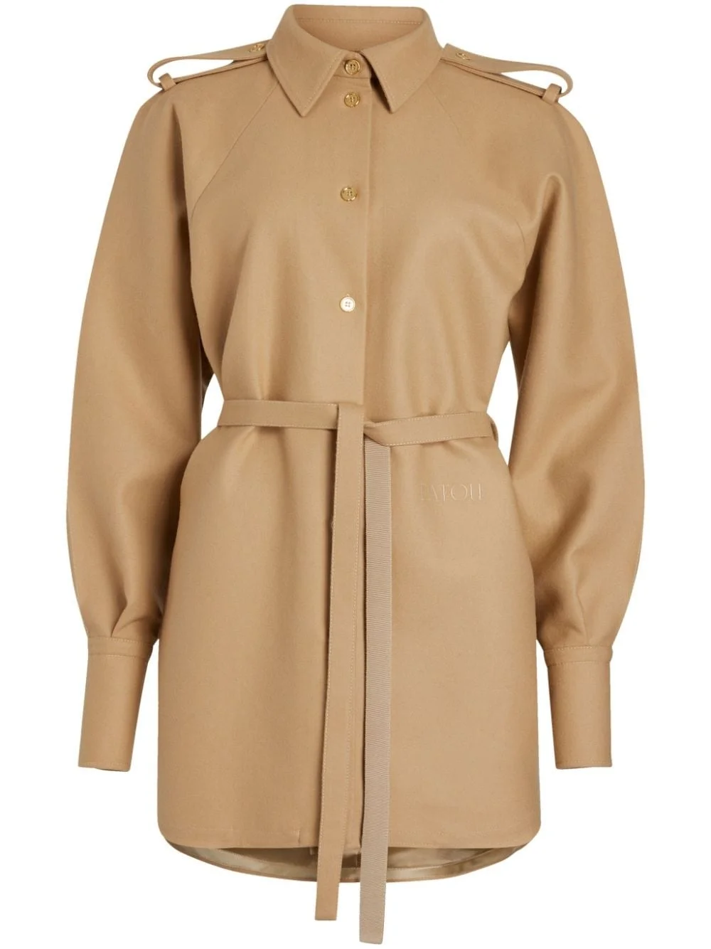 mini shirt dress Highlights - Sand beige - Virgin wool blend - Straight-point collar - Front button fastening - Epaulettes - Long raglan sleeves - Buttoned cuffs - Belted waist - Curved hem Imported Composition Outer: RWS Virgin Wool 80%, Polyamide 20% Lining: Viscose 100%