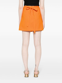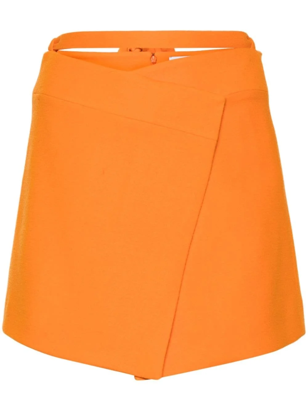 wraparound mini skirt Highlights - Orange - Virgin wool - Crepe texture - Wrap design - Dart detailing - Belt loops - Detachable adjustable waist strap - Concealed rear hook and zip fastening - Thigh-length - Asymmetric hem - Unlined Imported Composition Virgin Wool 100% SIZE & FIT Model measurements Height 5 ft 9 in(1.75 m) Bust/Chest 34.64 in(88 cm) Hips 36.61 in(93 cm) Waist 26.37 in(67 cm) FittingInformation This mini-length skirt is intended to be worn just below the waist The tie fastening gives an adaptable and personalised fit Made from a midweight non-stretch fabric This piece fits true to size – take your usual size
