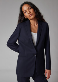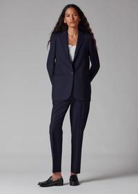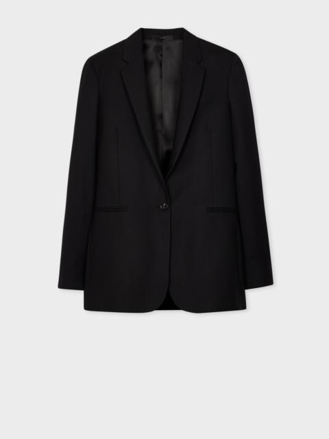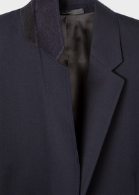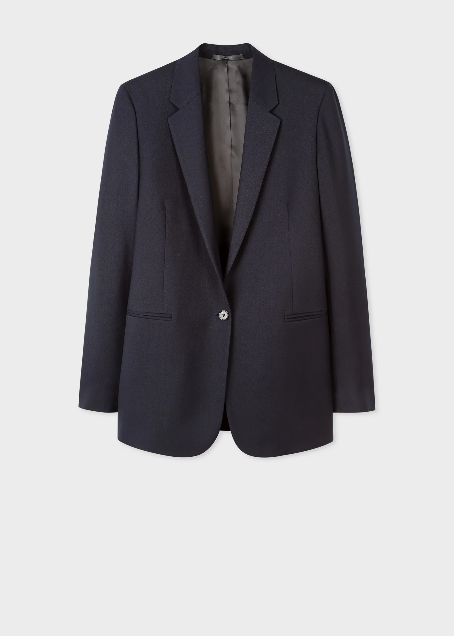 Made in Italy as part of the Paul Smith 'A Suit To Travel In' collection, this dark navy one button blazer is constructed using a high-twist yarn to create a quick recovery, crease-resistant 100% wool-twill cloth; providing a versatile and highly-practical piece of tailoring. * One-button fastening * Single vent * Contrast cupro lining with internal jetted pockets * Flap pockets * Woven, 100% Wool * Dry Clean Only * Made in Italy The Size Model wears a size 40 (UK 8) Model measures: Height 5’10’’ / 178cm | Bust 31.5’’ / 80cm | Waist 25”/ 63cm The Fit This Straight-Fit travel blazer is cut for a boxy-fit that finishes at a longer length that ends around the hips and has thin shoulder pads for a more casual and refined look. Product Code: W1R-254J-M00001-49