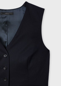 Made in Italy as part of the Paul Smith 'A Suit To Travel In' collection, this navy waistcoat is constructed using a high-twist yarn to create a quick recovery, crease-resistant 100% wool-twill cloth; providing a versatile and highly-practical piece of tailoring. In a classic waistcoat silhouette with a contrast five-button closure, subtle rear vent, faux pockets at the front, and a luxurious viscose lining. The Size Model wears a size 40 (UK 8) Model measures: Height 5’11’’ / 180cm | Chest 30½’’ / 78cm | Waist 24’’ / 61cm The Fit - Tailored-Fit has a streamlined shape following the natural form of the torso Product Code: W1R-388J-T00001-49
