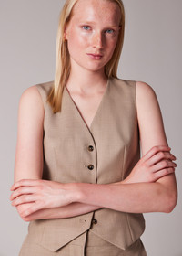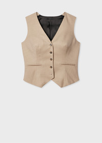Made in Italy as part of the Paul Smith 'A Suit To Travel In' collection, this stone waistcoat is constructed using a high-twist yarn to create a quick recovery, crease-resistant 100% wool-twill cloth, providing a versatile and highly practical piece of tailoring. In a classic waistcoat silhouette with a contrast five-button closure, subtle rear vent, faux pockets at the front, and a luxurious viscose lining. The Size Model wears a size 40 (UK 8) Model measures: Height 5’11’’ / 180cm | Chest 30½’’ / 78cm | Waist 24’’ / 61cm The Fit - Tailored-Fit has a streamlined shape following the natural form of the torso Product Code: W1R-388J-T00001-60A