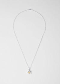 Sterling silver square one pendant set with yellow sapphire on a 20 inch Figaro chain. Presented in a dual branded gift-box. * Made in Britain * Sterling Silver * Lab yellow Sapphire * 20 inch Figaro chain [b]Alec Doherty[/b] Alec Doherty is an artist working in London, UK. His work is about nuances of human behaviour, often focused on interaction and body language. Alec works with different mediums, from pencil on paper through to large scale sculpture. In 2021 Alec incorporated his jewellery company, an extension of his creative practice, creating fine jewellery for all genders. Made in Britain. His latest jewellery collection exclusive for Paul Smith, was inspired by the stories of challenging moments and turning points in the lives of his friends and family – the series gives us a glimpse into the lives of others; first kisses, going to prison, giving birth. Stories different to our own, but with shared emotion, a nervous energy we can all relate to and an ability to embrace change. The collection features six rings and eight necklaces which are made from silver set with Gemstones and engravings representing the wearer’s inner spirit. Product Code: GRB-ALCD-AHPD4-82
