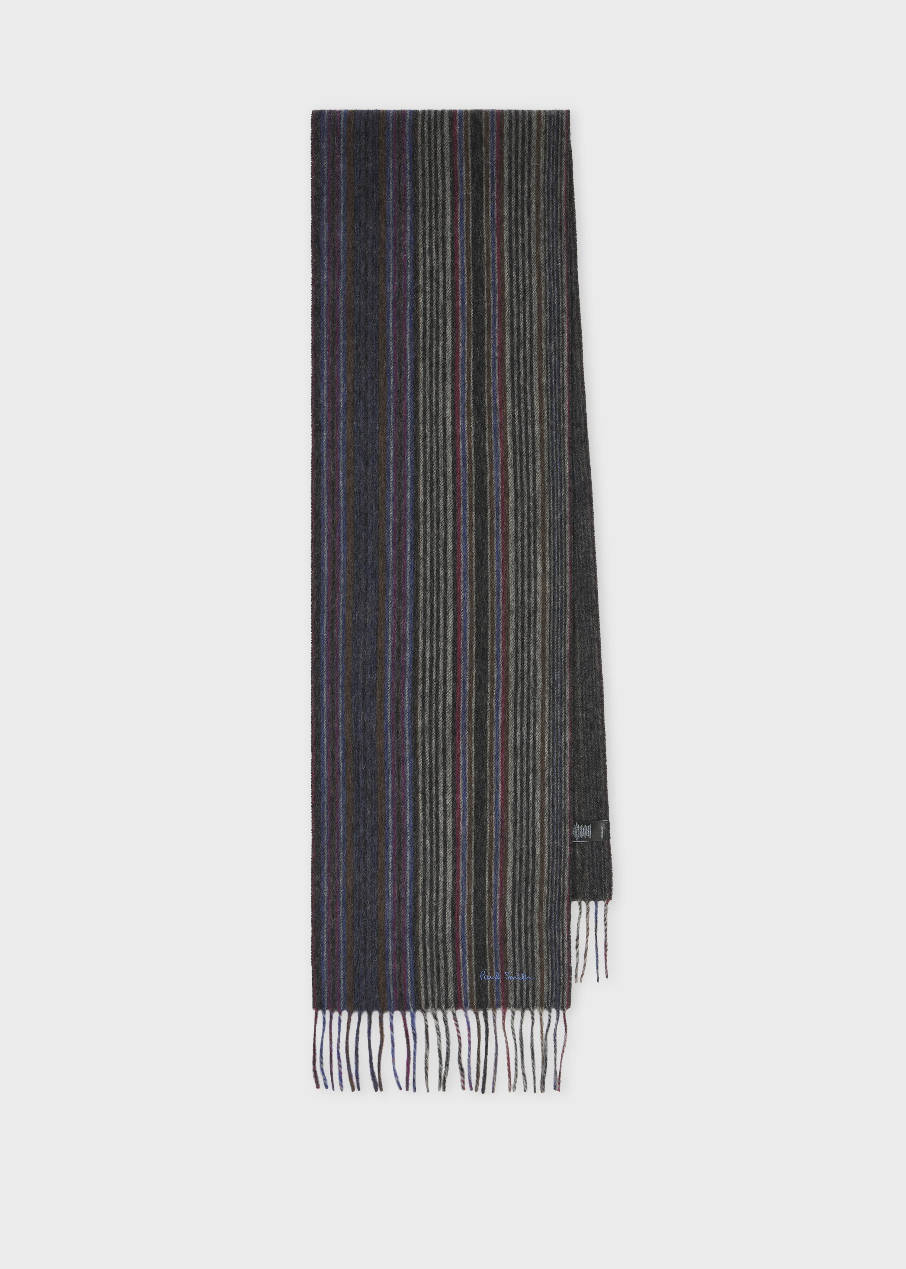 Made from a soft lambswool, this grey scarf features a tonal stripe design and subtle signature embroidery detailing. An ideal accessory to add a pop of colour to your look, this cosy scarf is finished with long frayed edges. Product Code: M1A-150K-T640-76