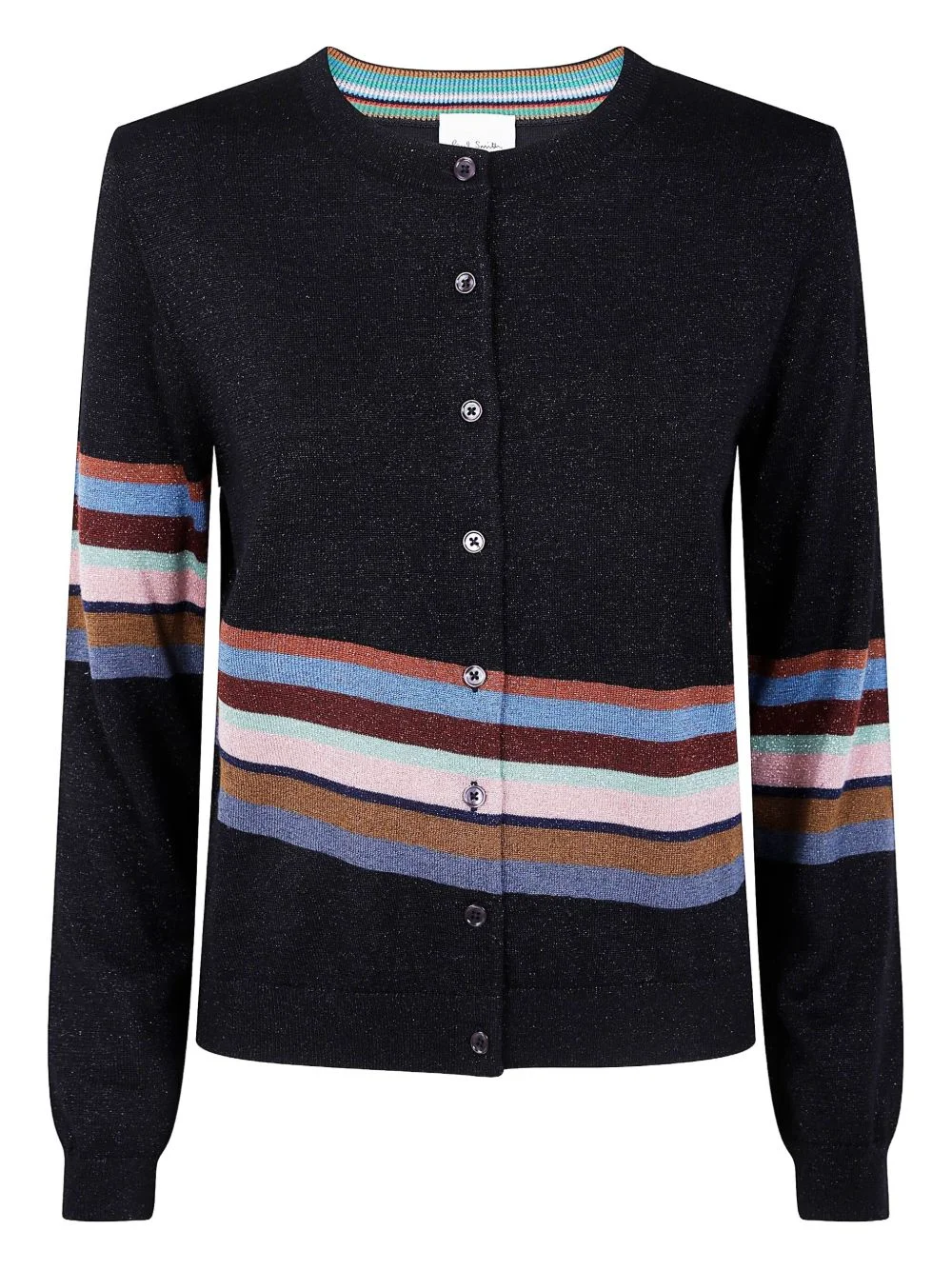 glitter-striped cardigan Highlights - Black - Wool blend - Button fastening - Diagonal stripes - Long sleeves - Glitter effect Imported Composition Merino 80%, Polyester 13%, Metallised Fibres 7% Washing instructions Read Manufacturer Guidelines