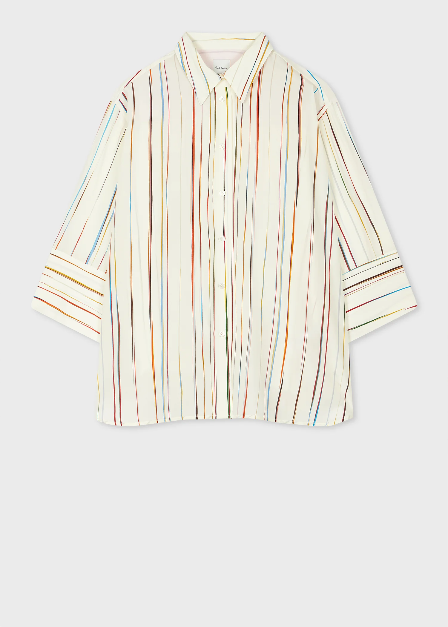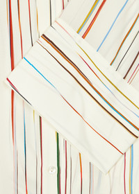 Made from a sleek silk composition, this cream short-sleeve shirt features a reimagnined 'Signature Stripe' pinstripe design. Cut to a relaxed fit with dropped shoulder seams and a dropped hem for effortless styling. The lightweight loose feel makes this shirt the perfect seasonal staple. 100% Silk Dry Clean Only The Size Model wears a size 40 (UK 8) Model measures: Height 5’11’’ / 180cm | Chest 30½’’ / 78cm | Waist 24’’ / 61cm The Fit - Relaxed-Fit is loose through the body. Product Code: W1R-370B-T11135-04