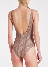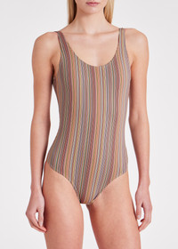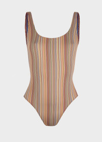 Ideal for your next getaway, this premium swimsuit features our iconic 'Signature Stripe' all-over. This statement swimsuit is complete with a flattering scoop neckline and low back design. 86% Polyamide, 14% Elastane Machine washable Product Code: W1A-652EN-KU342-92