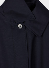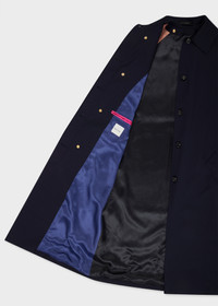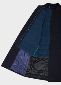 Made from a technical wool cloth made in Italy by Loro Piana and treated with Storm System® for a waterproof and wind-resistant finish, this long navy mac has raglan sleeves and features a slate blue quilted detachable sleeveless liner which is attached with press stud fastenings. Complete with a removable waist belt, this luxurious coat is finished with contrasting black and cobalt blue cupro lining. Buckle details on sleeves Concealed placket Single vent Angled welt pockets Woven, 100% Wool Detachable liner - 100% Polyester Dry clean only Made in Italy Product Code: W1R-097C-M00041-49