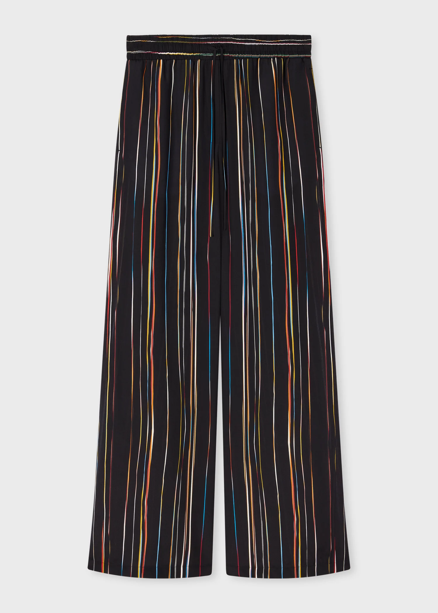 Made from a rich silk composition, these dark navy wide-leg trousers feature a pinstripe 'Signature Stripe' print for a distinctive touch. The trousers are complemented with an elasticated waistband with additional drawstring detailing and are complete with side seam pockets. Perfect for effortless styling, the trousers can be paired with a cami and sandals for warmer days or a lightweight tonal knit for transition styling. 100% Silk Dry clean only The Size Model wears a size 40 (UK 8) Model measures: Height 5’11’’ / 180cm | Chest 30½’’ / 78cm | Waist 24’’ / 61cm Product Code: W1R-347T-T11135-49