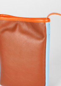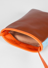 Made in Spain from premium soft leather, this small pouch bag features tan, sky blue and orange panels. Finished with a mag-dot closure, beige twill lining and embossed Paul Smith signature logo detail. Height: 20cm x Width: 14cm Top of strap to bag: 59cm 100% Cow Leather Made in Spain Signature logo dust bag included Product Code: M1A-8143X-NPOUCH-68
